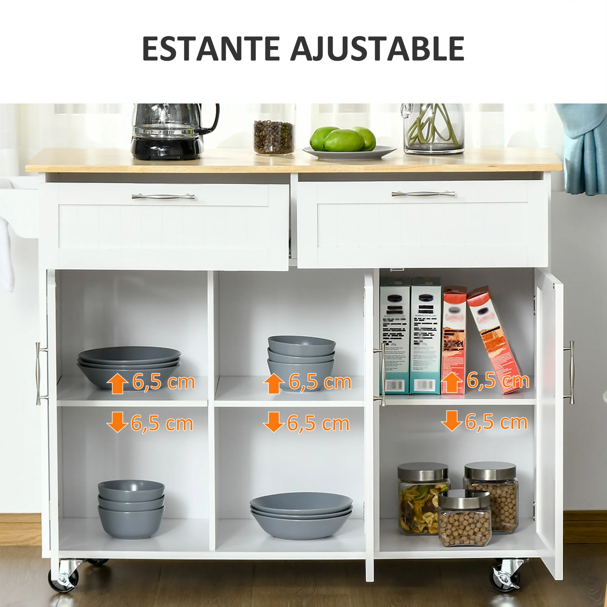 ● Carga máxima: 50 kg (total), 20 kg (encimera), 8 kg (estantes) y 5 kg (cajones)
