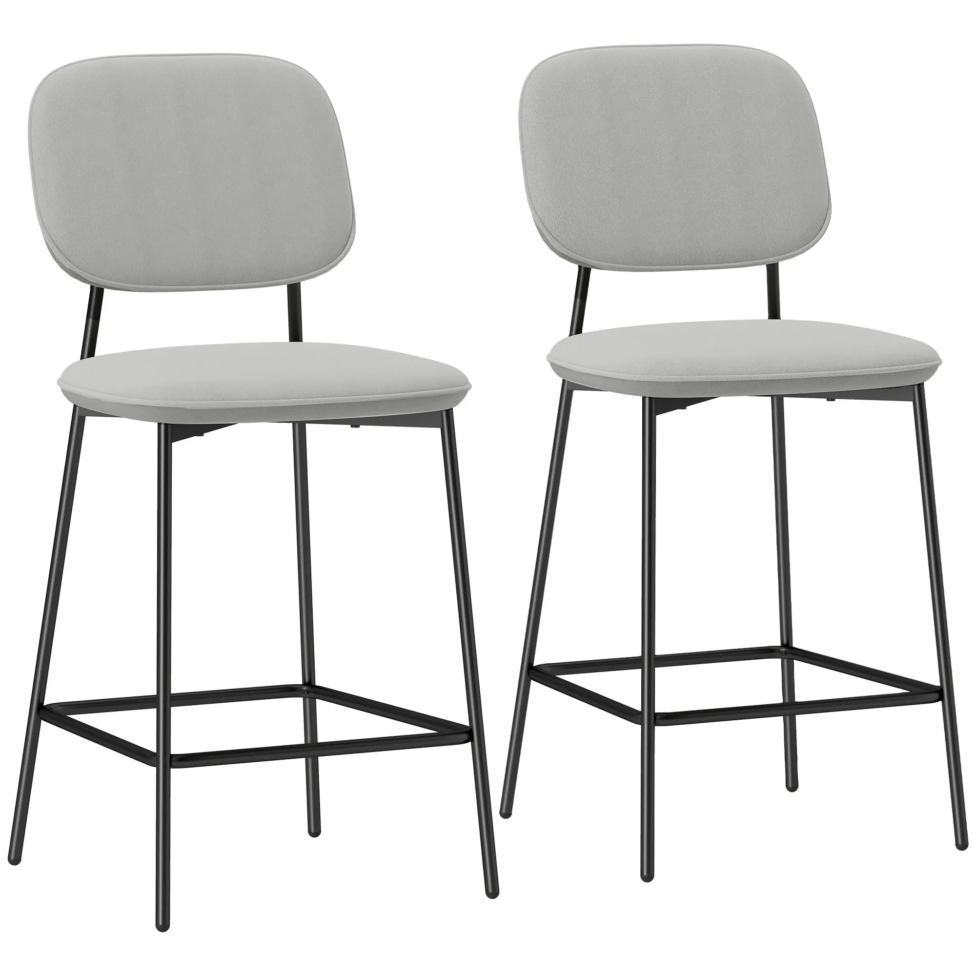 Disfruta del confort de este conjunto de taburetes altos de HOMCOM, diseñados con un tapizado suave de tacto aterciopelado y acolchado de espuma, garantizando una gran comodidad. La estructura de acero aporta estabilidad, mientras que la combinación de colores negro y gris le da un toque moderno y elegante. Estos taburetes para cocina incluyen respaldo y barra a modo de reposapiés para mayor comodidad.