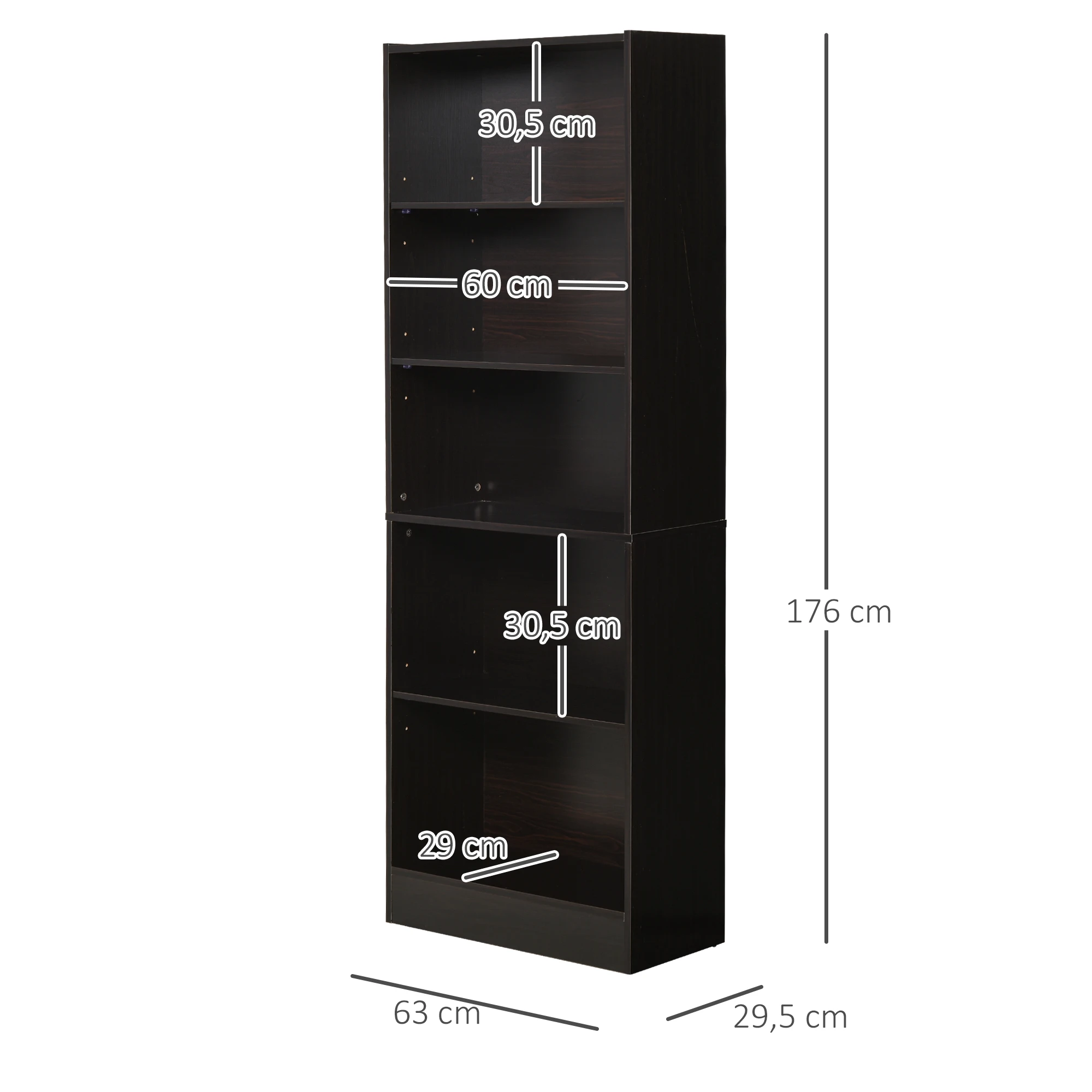 - Color: madera natural;- Material: melamina y MDF;- Medidas totales: 63x29,5x176 cm (LxANxAL);- Medidas de cada nivel: 60x29x30,5 cm (LxANxAL);- Carga máxima: 8 kg (cada estante);- Referencia: 836-252ND;