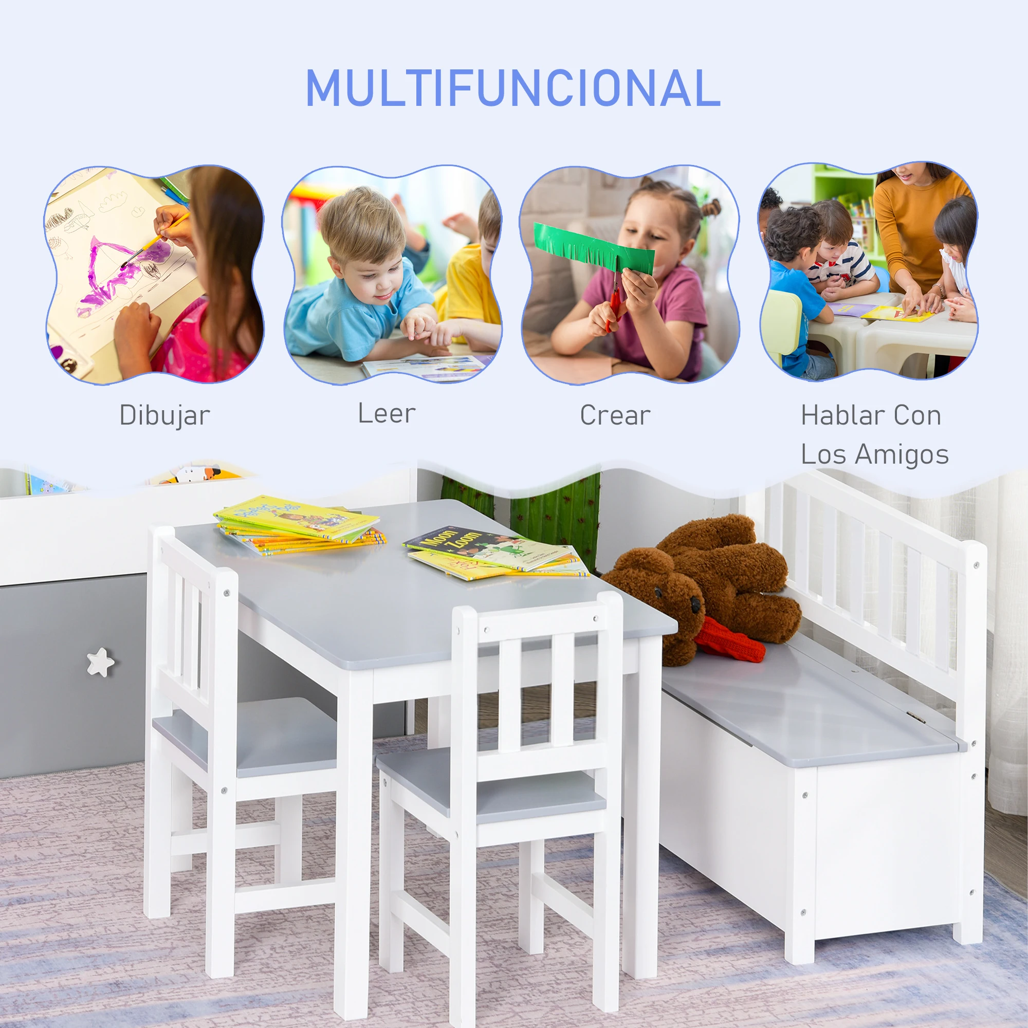 Comprar HOMCOM Mesa y Sillas Infantiles de 4 Piezas Mesa Infantil con 2 Sillas y Banco con Almacenaje Juego de Muebles para Actividades para Niños de +3 Años para Dormitorio Sala de Juegos Gris y Blanco
