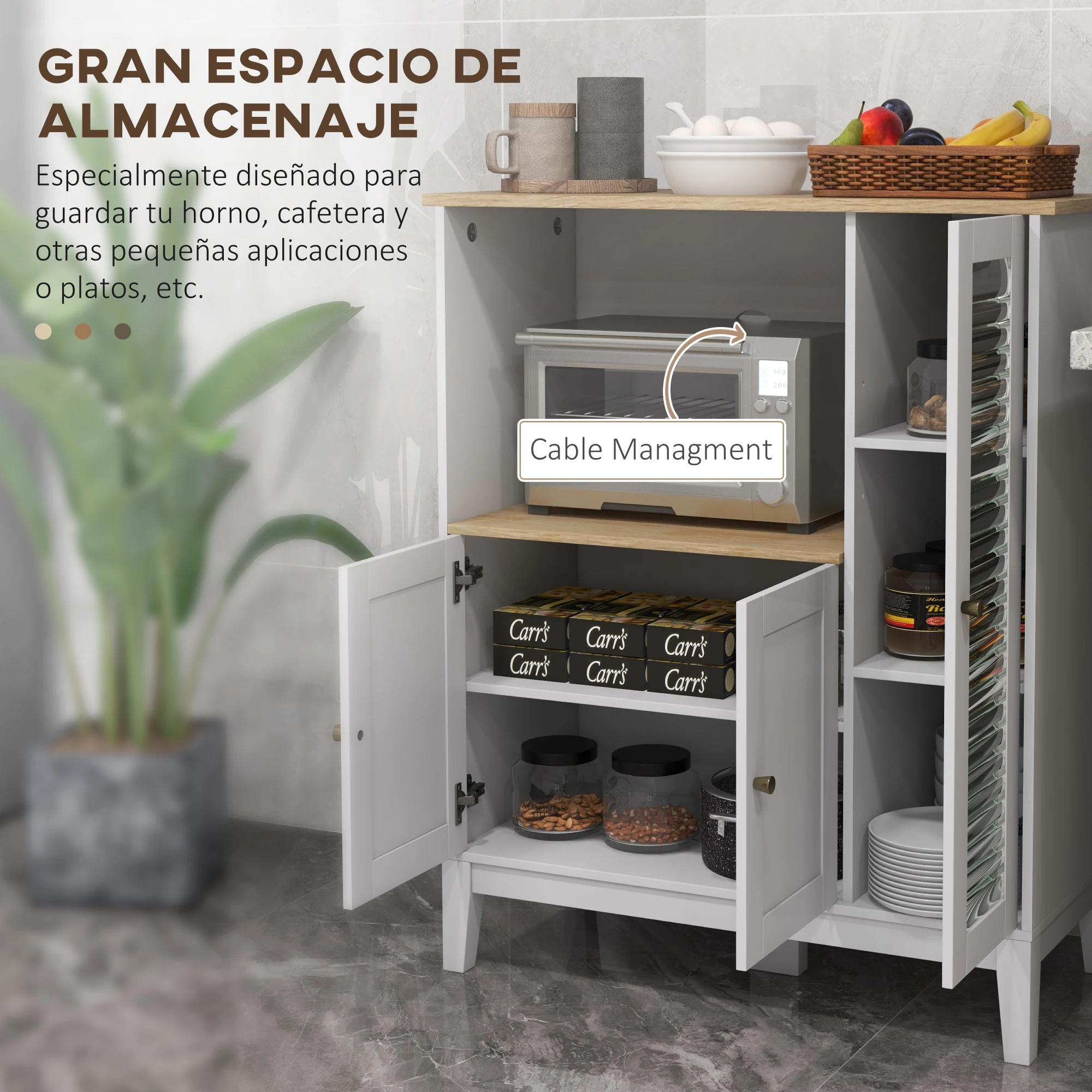 ● Este mueble de cocina auxiliar incluye un estante ajustable dentro del armario con puerta transparente para organizar el espacio