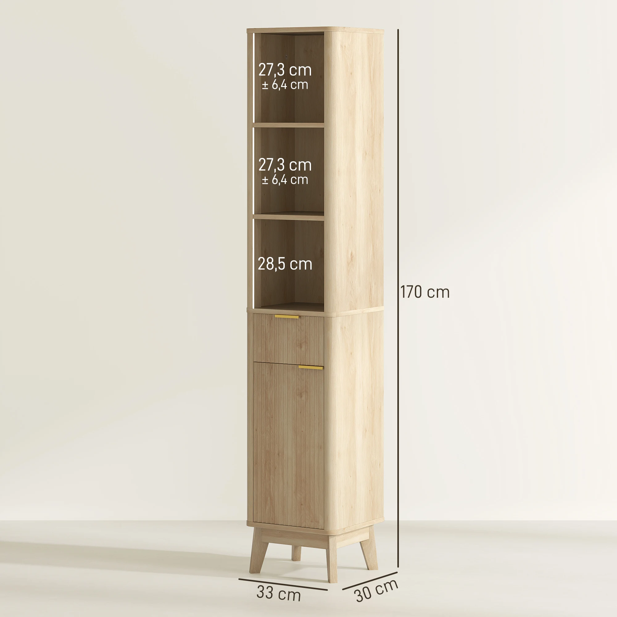 Mejora tu baño con esta columna alta y estrecha. Este armario es perfecto para aprovechar al máximo el espacio en baños pequeños. Con tres estantes abiertos, un cajón y un armario con dos estantes ajustables en tres niveles, tendrás suficiente espacio para organizar tus productos de baño de forma práctica. Su diseño sencillo y elegante encajará perfectamente en cualquier estilo de baño, añadiendo funcionalidad sin sobrecargar el espacio.