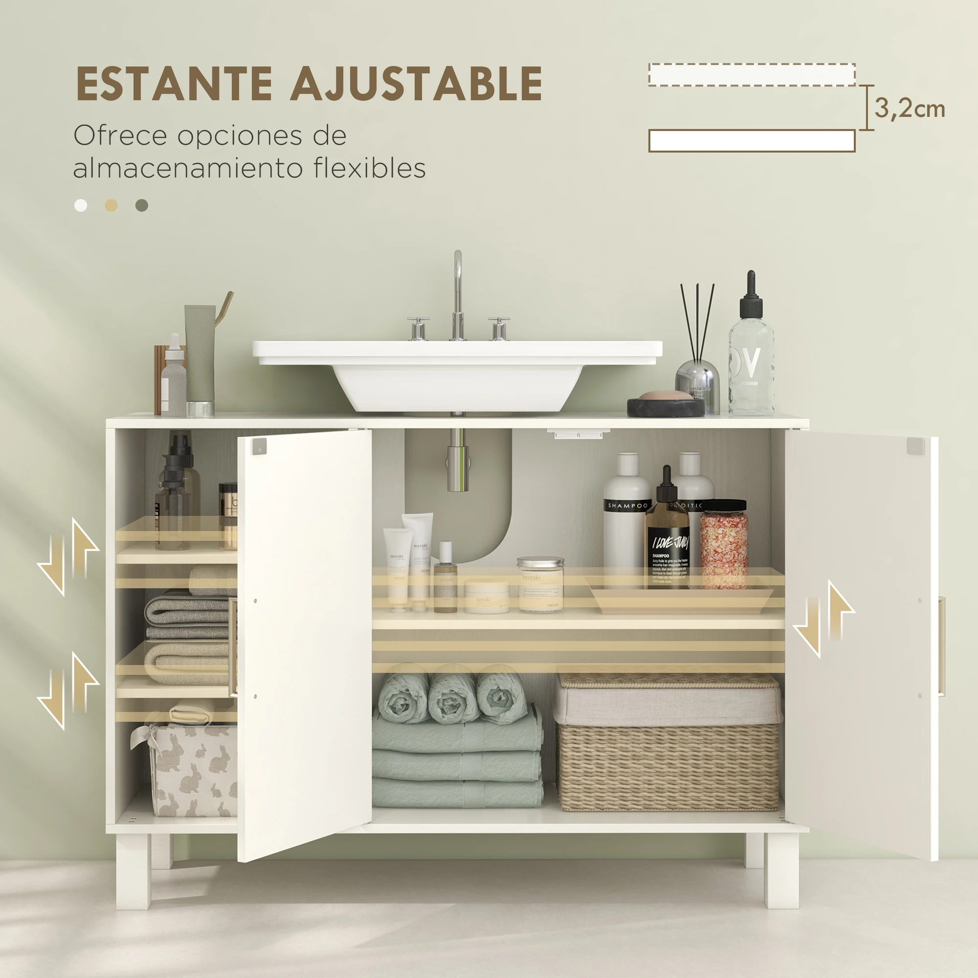 Renueva tu baño con este mueble para debajo del lavabo de HOMCOM, diseñado específicamente para lavatorios suspendidos gracias a su ranura en U de 15 x 20 cm. Aprovecha al máximo el espacio disponible con tres estantes y un armario de dos niveles ajustables, ideales para almacenar gran variedad de objetos. Con un acabado en blanco crema y elegantes puertas arqueadas, este mueble combina sofisticación y funcionalidad, siendo la solución perfecta para mantener tu baño siempre ordenado.