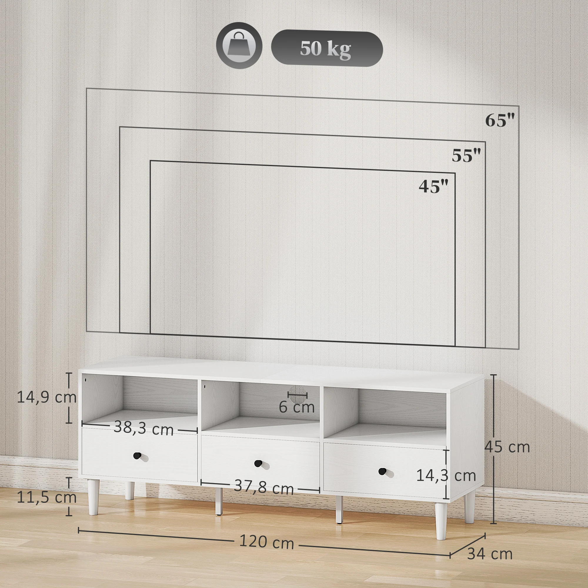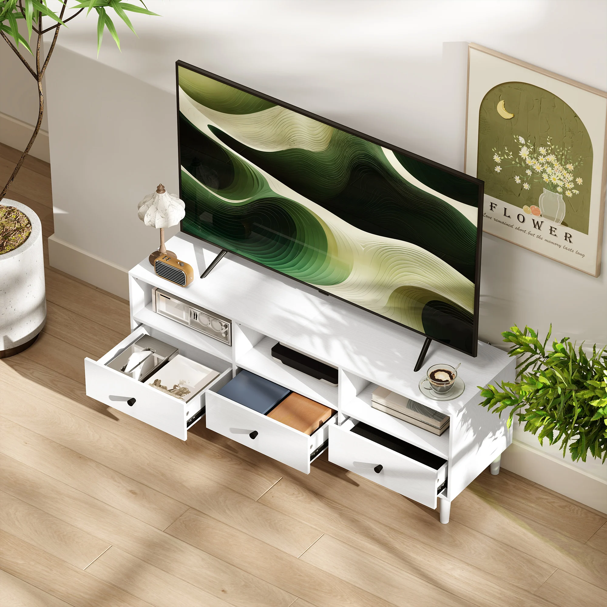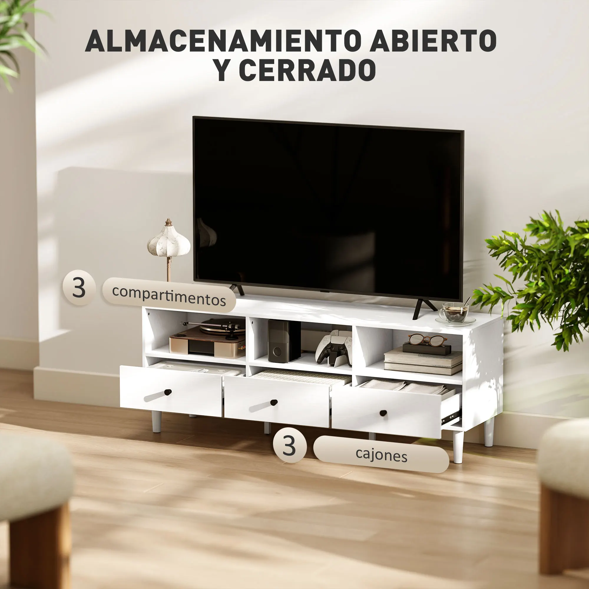 ● Este mueble de televisión para salón con tres cajones ofrecen espacio para pequeños objetos