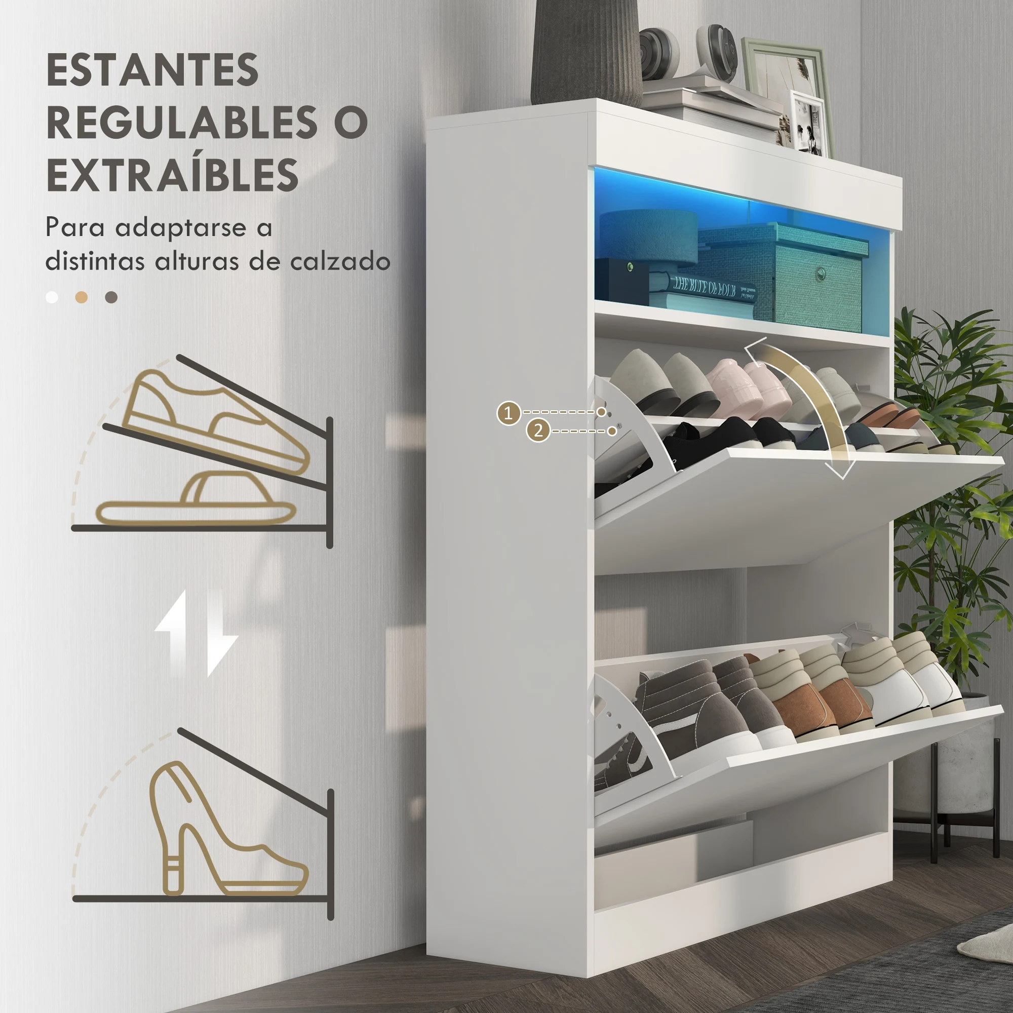 Ilumina tu entrada con este zapatero de madera de HOMCOM que se puede ajustar cómodamente a tu pared y llama la atención a primera vista. Con luces de tira LED RGB con 16 colores ajustables y 4 modos que se pueden controlar con el mando a distancia incluido, este mueble para zapatos no solo ahorra espacio, sino que también añadirá un toque de modernidad a tu decoración.