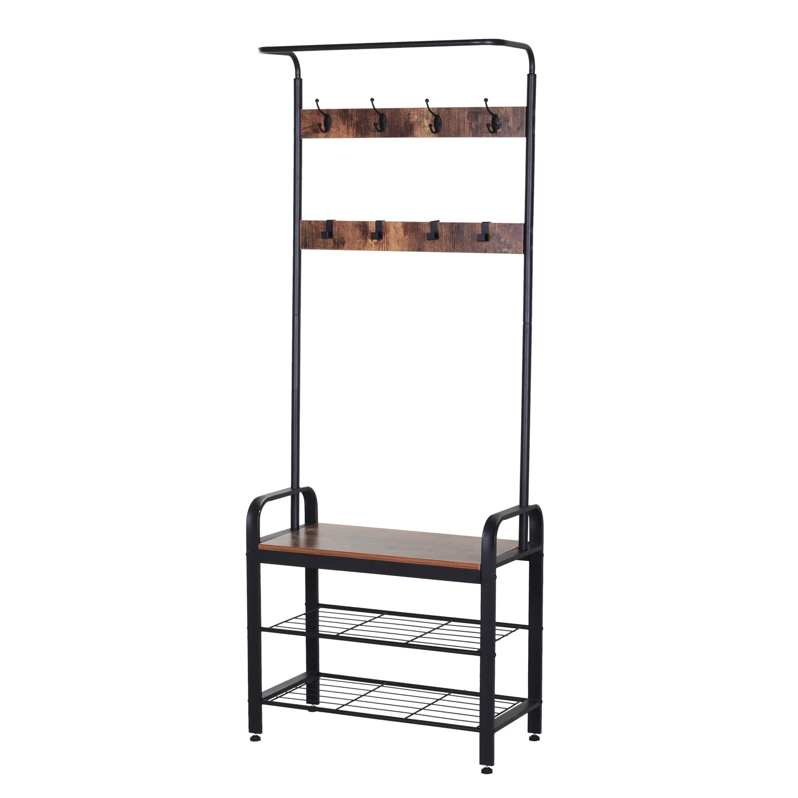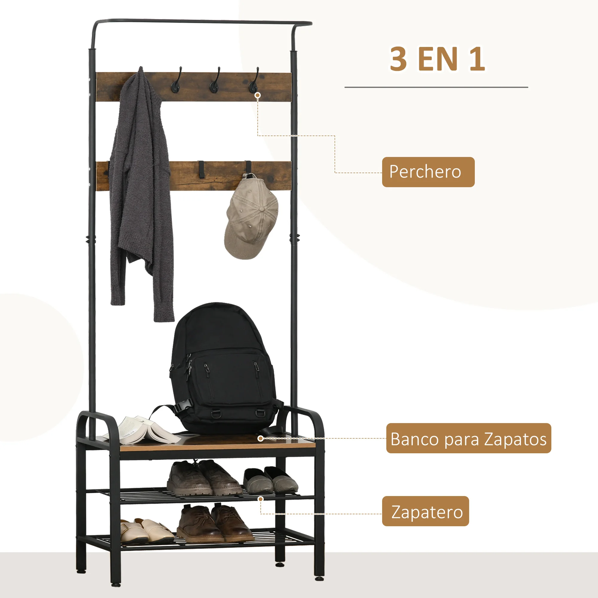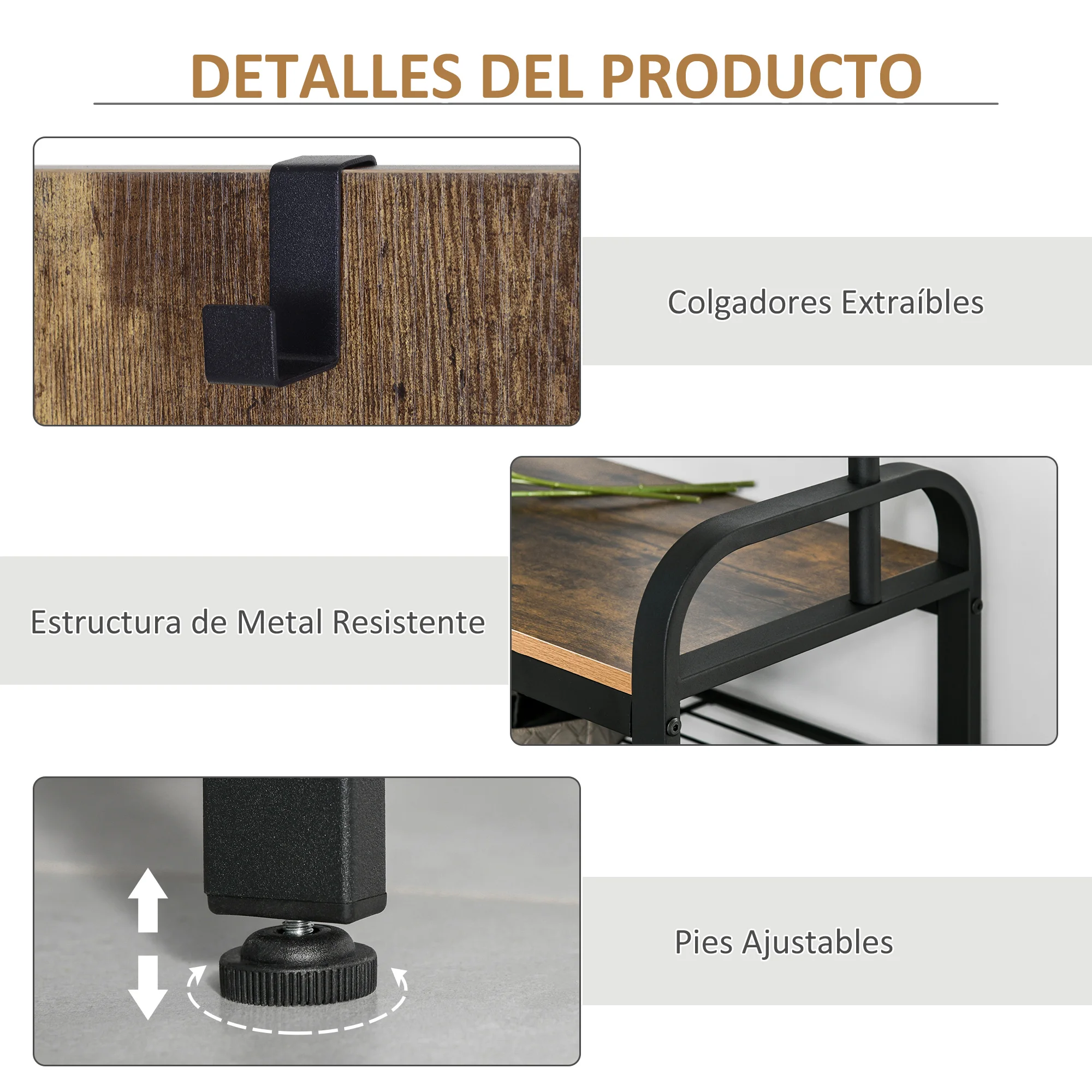 ¿No sabes dónde dejar la chaqueta y los zapatos cuando entras en casa? Este zapatero con perchero incorporado y asiento de HOMCOM ¡te va a encantar! Empecemos por su diseño, de aire industrial, con estructura metálica y MDF efecto madera oscura. Es fantástico para darle un toque de estilo loft neoyorquino a tu casa, porque su estilo industrial recuerda al estilo de decoración utilizado en esos tipos de vivienda. No te olvides de su funcionalidad. Colocado en el recibidor tendrás un mueble que ocupa poco y que ofrece mucho. Tiene 8 ganchos que puedes utilizar como quieras (para colgar bolsos, abrigos, bufandas, etc.) y una barra en la parte superior que puedes utilizar para colgar más abrigos o camisas en perchas. En su parte inferior tienes 2 estantes de rejilla para colocar los zapatos¡El zapatero con perchero ideal para ese rincón que tienes sin aprovechar!