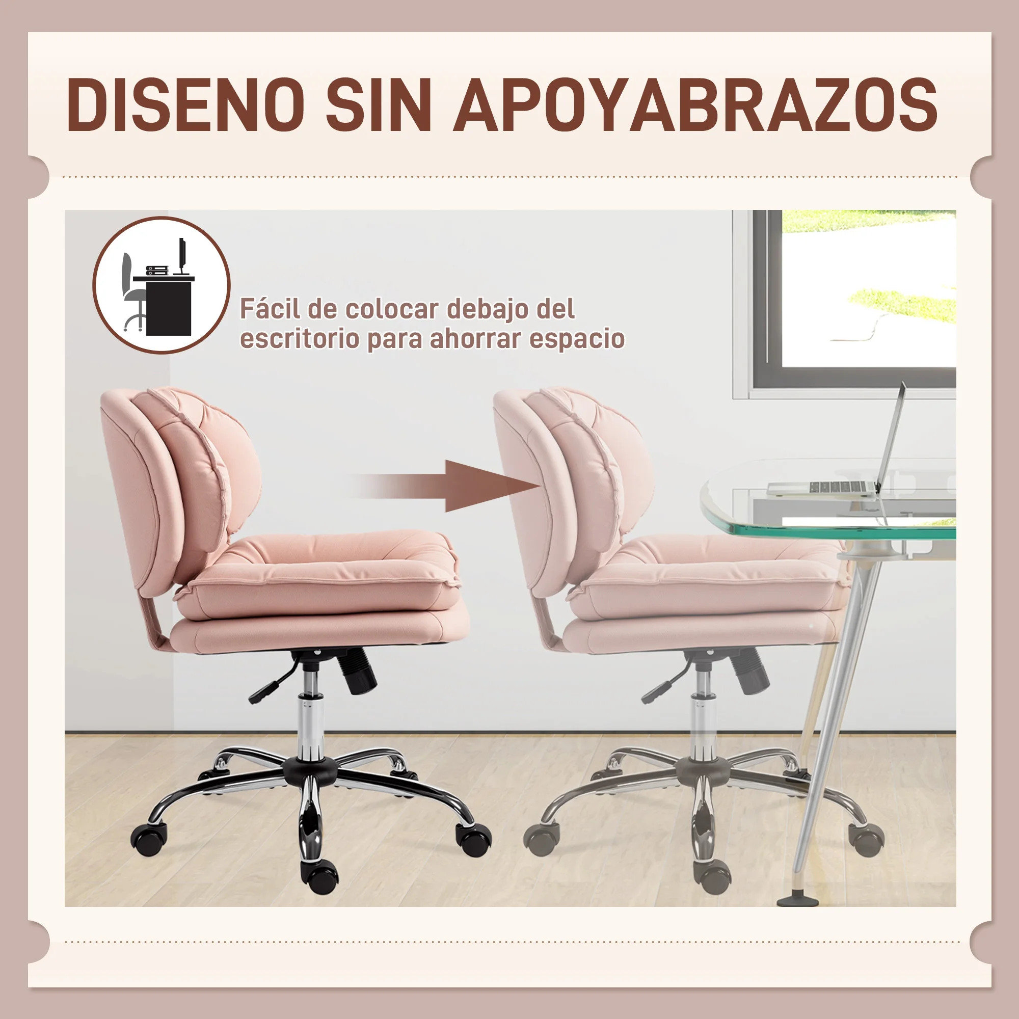Comprar HOMCOM Silla de Oficina Piernas Cruzadas, Silla de Escritorio sin Brazos con Asiento Ancho, Ruedas, Altura Ajustable, Doble Acolchado, Giratoria, Función Basculante, Tapizada en PU, Rosa