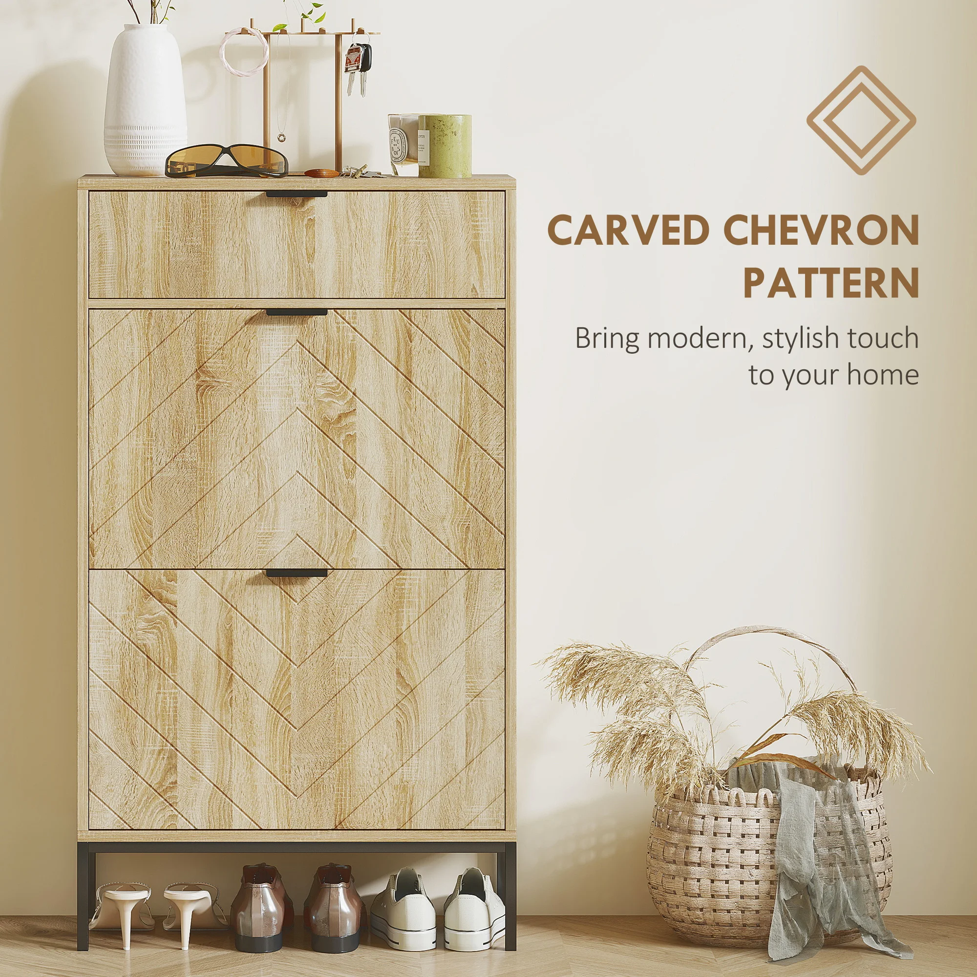 Dale estilo y funcionalidad a tu entrada con este zapatero de HOMCOM. Pensado para simplificar tu rutina, cuenta con dos compartimentos abatibles con divisores ajustables para hasta 8 pares de zapatos y un cajón superior ideal para llaves o accesorios. Gracias a su diseño estrecho, encaja en espacios pequeños como pasillos, apartamentos o entradas. El acabado efecto madera y el patrón en chevrón aportan un toque moderno que transforma cualquier rincón.