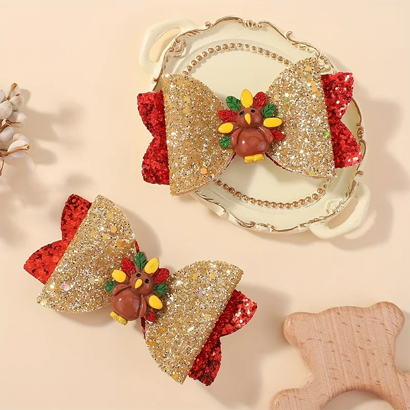 Horquilla con lazo de pavo para el Día de Acción de Gracias, pinzas para el pelo con lazo brillante para niña, accesorios para el cabello para fiesta de vacaciones, 2 uds.