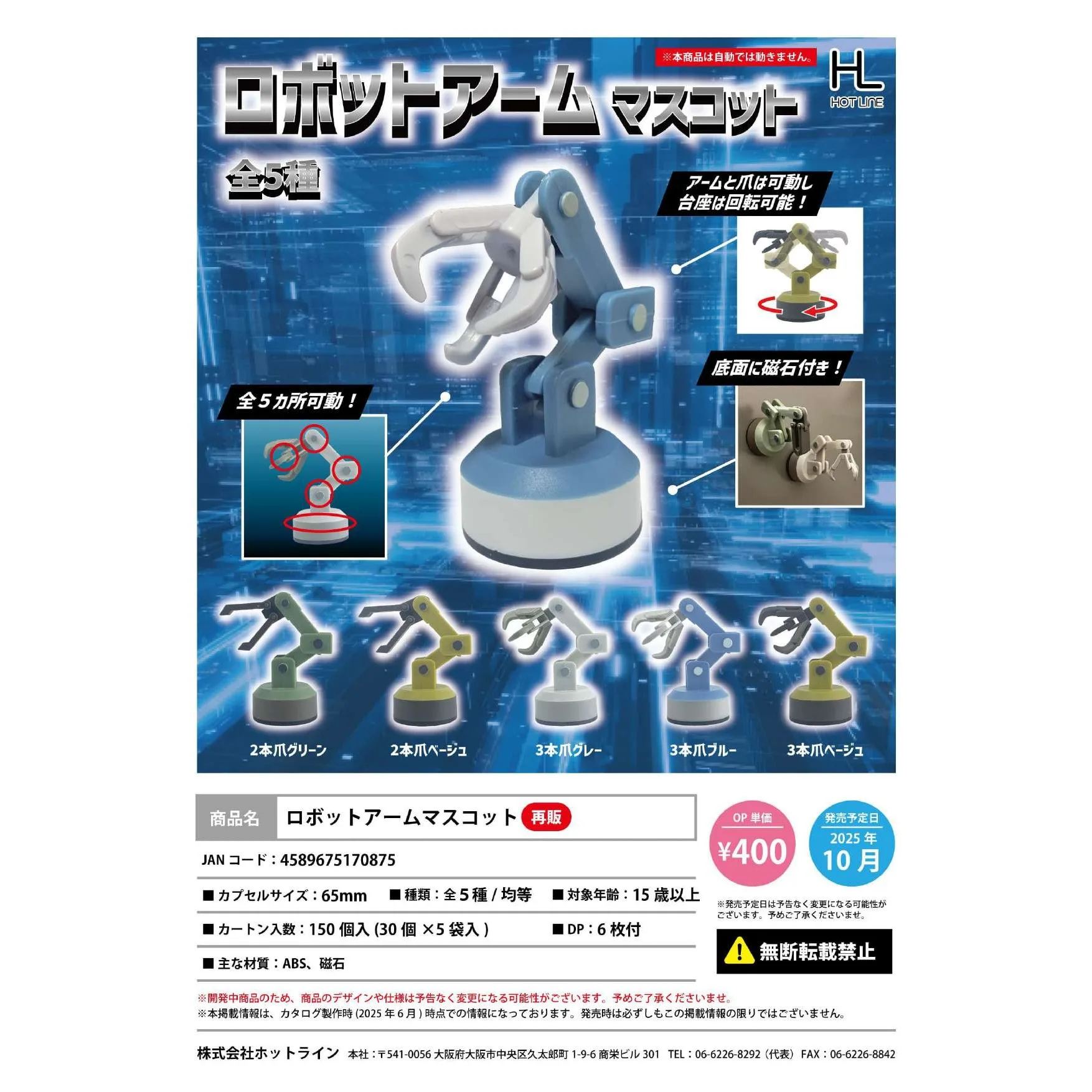 Máscara de brazo robótico ★Juego de 5 Máscara de brazo robótico El brazo y las garras son móviles. ¡La base se puede girar! ◆Contenido: 1 2 garras verdes 2 2 garras beige 3 3 garras de color gris 4 3 garras azul 5 3 garras beige ¡Imán en la parte inferior! Fabricante: Línea directa Materiales principales: ABS, imán JAN: 4589675170875 Edad recomendada: 15 años en adelante