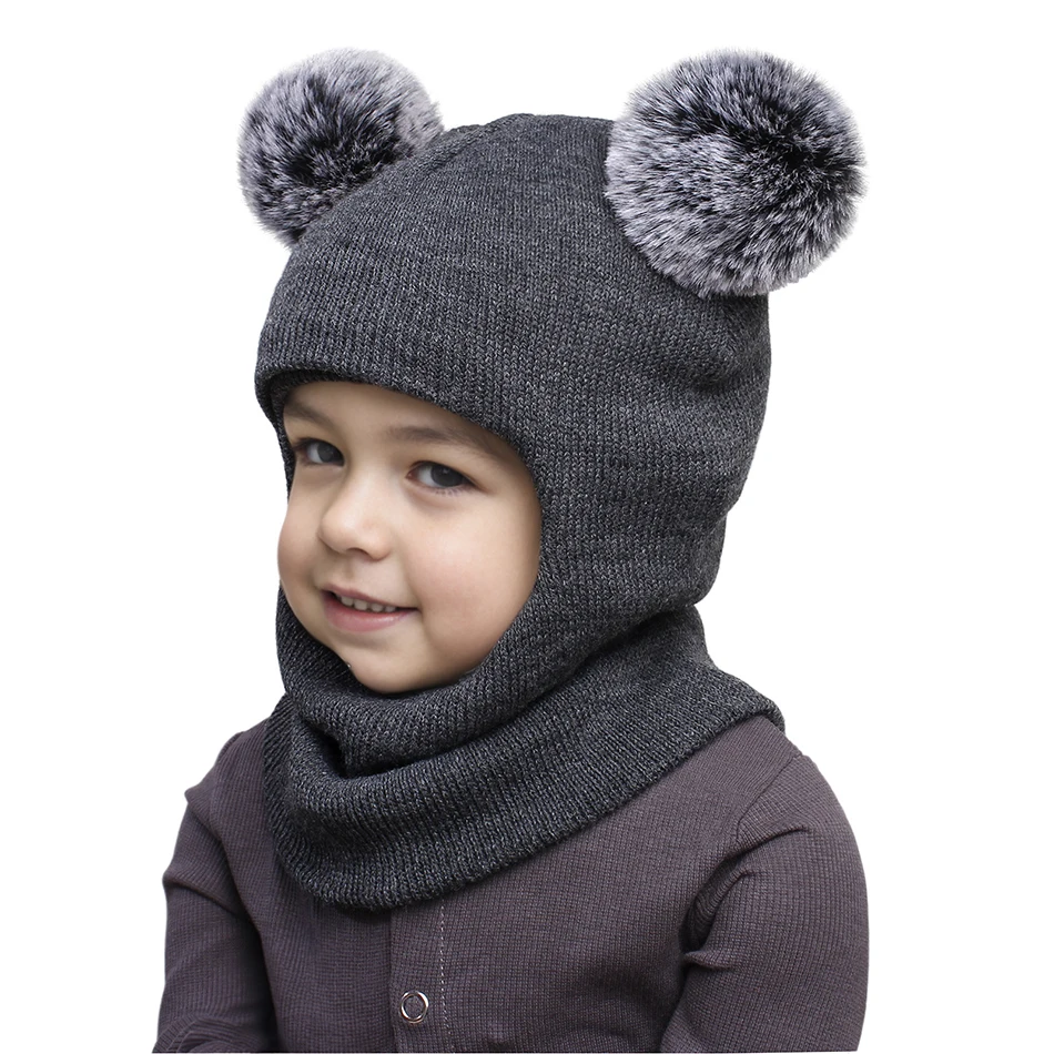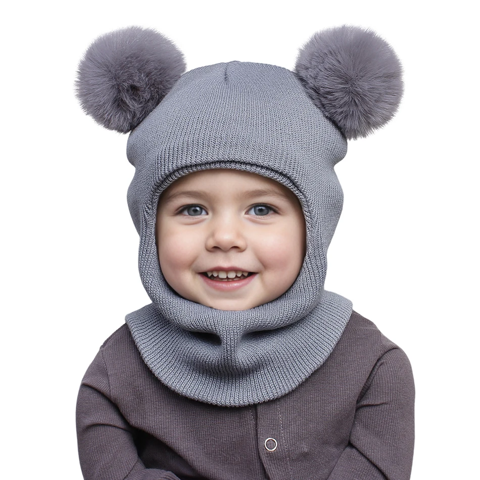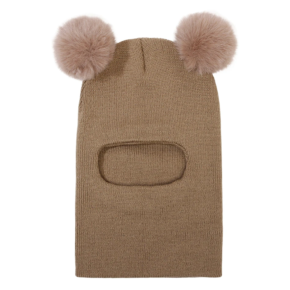Nombre del vestido: Gorro de punto cálido para bebé unisex con pompones, orejeras térmicas, gorro de invierno bonito para niños y niñas, accesorio con capucha para niños