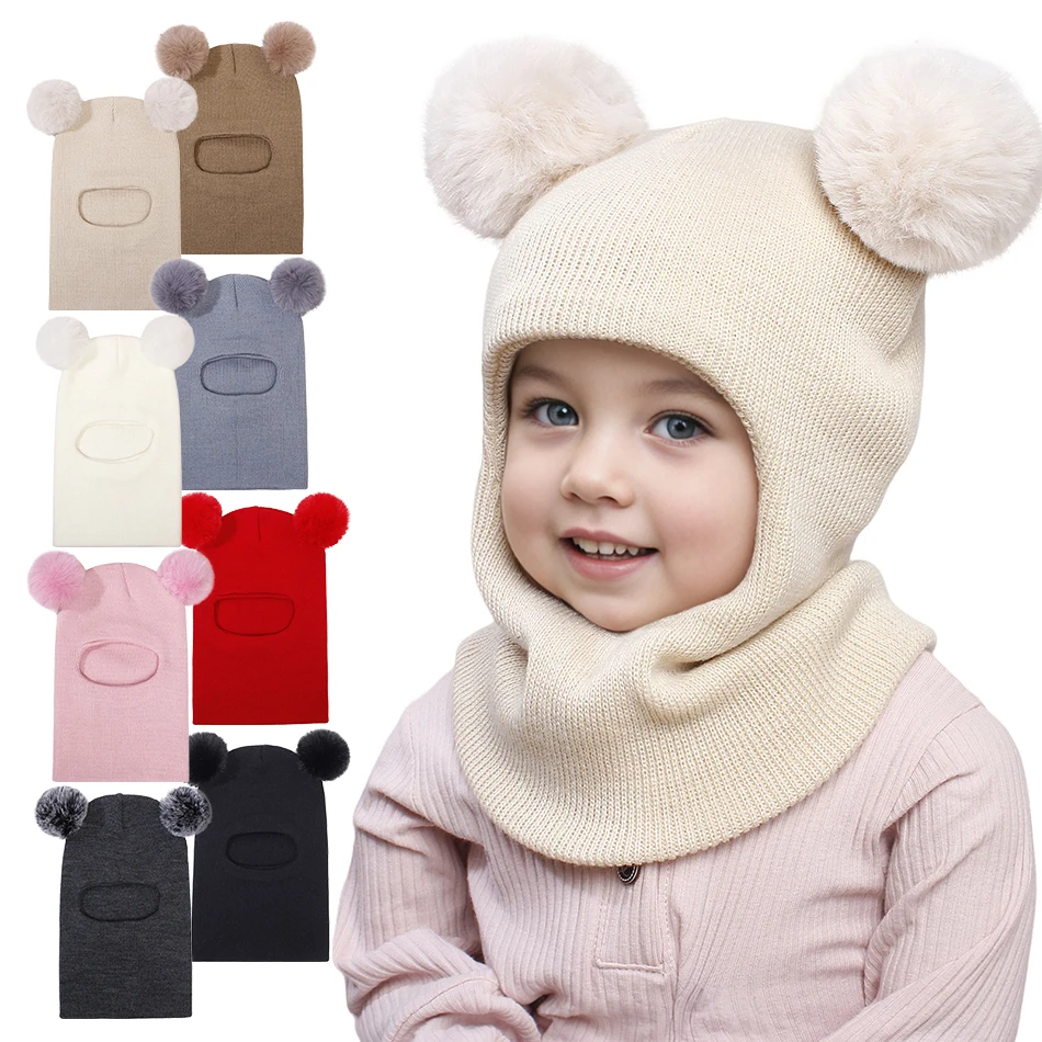 Comprar Jersey de punto cálido Unisex para bebé, gorro con pompones, orejeras térmicas, bonito gorro de invierno para niños y niñas, accesorio para capucha