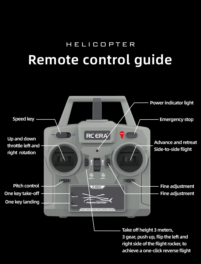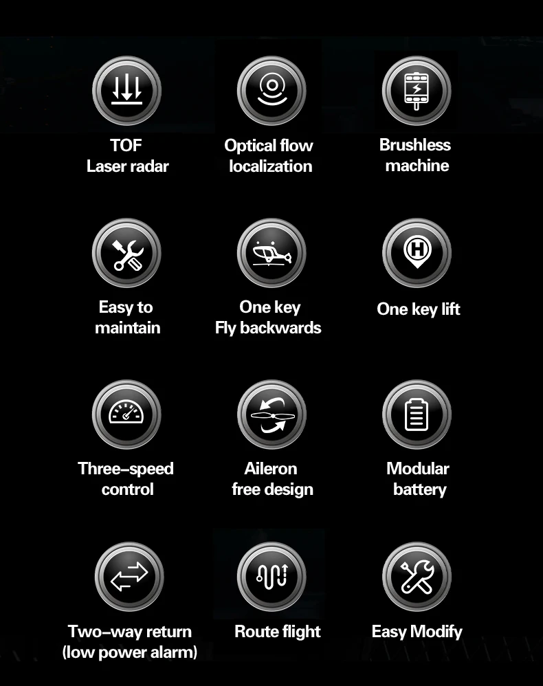 8 funciones que incluyen alarma de bajo voltaje, protección de rotor bloqueado, protección contra pérdida de control, conversión de timón grande y pequeño, despegue con una sola tecla, aterrizaje con una sola tecla, etc.;