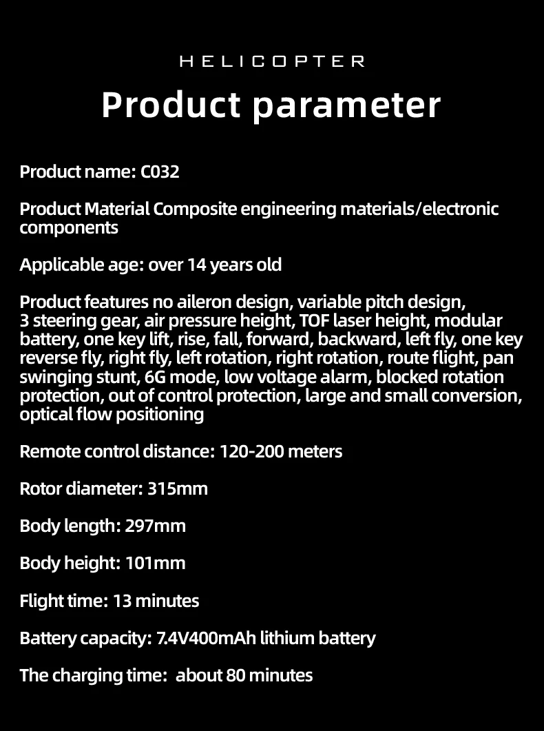 Adoptando un diseño de una sola hoja sin alerones, un giroscopio electrónico de 6 ejes para mejorar la estabilidad e incorporando un manómetro para determinación de altitud, posicionamiento de flujo óptico y TOF LiDAR para determinar la altitud, ¡el vuelo es más estable y más fácil de controlar!¡Batería de duración ultralarga!¡Resistente a impactos!La apariencia se reduce proporcionalmente al avión real, lo que le permite no solo controlar el vuelo sino que también servir como pieza decorativa.¡La duración de la batería del C032 puede alcanzar unos 13 minutos!