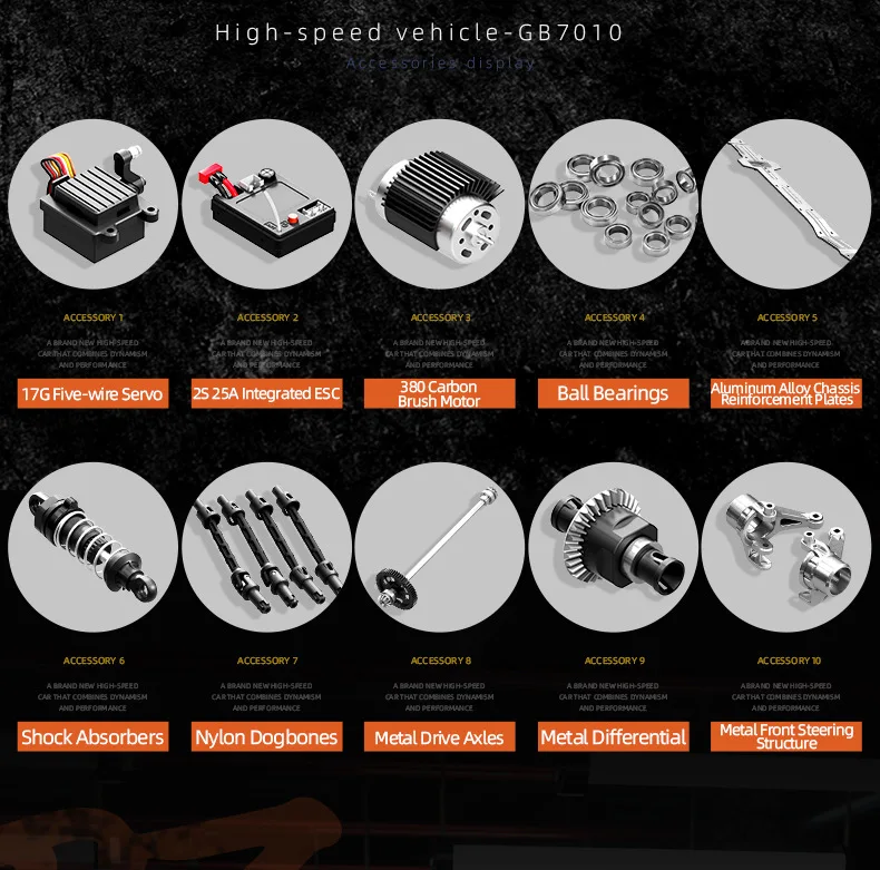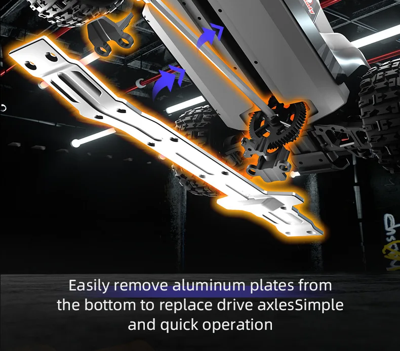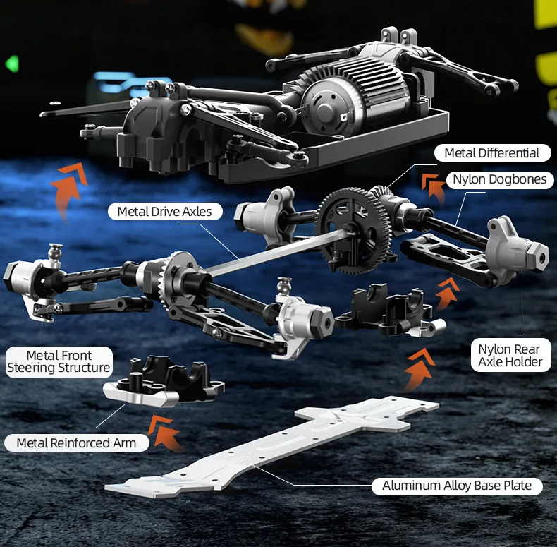 10, piezas de metal: Placa de refuerzo inferior de metal, diferencial de metal, engranaje de metal, nudillo de dirección de metal, código de brazo delantero y trasero de metal, eje de transmisión de metal;