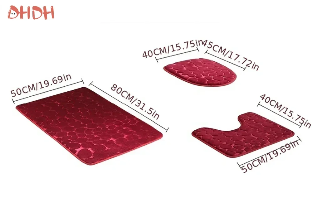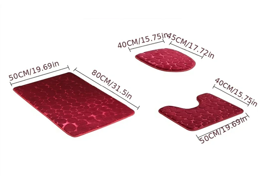 Alfombrilla rectangular: 50x80 cm (19,69x31,50 pulgadas), alfombrilla para inodoro en forma de U: 40x50 cm (15,75x19,69 pulgadas), funda para asiento de inodoro: 40x45 cm (15,75x17,72 pulgadas).