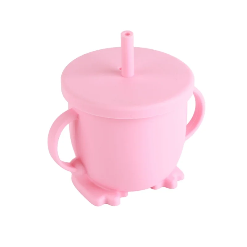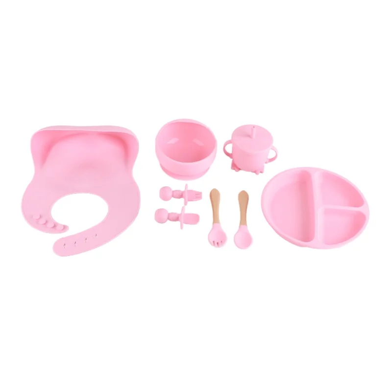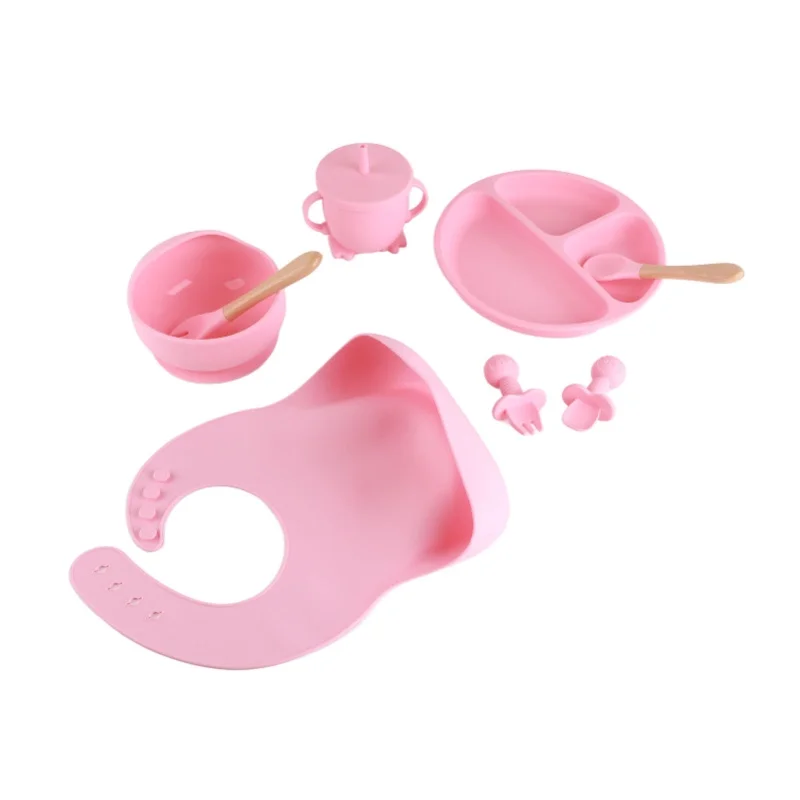 Comprar Juego de alimentación de bebé de silicona, babero, plato de succión, cuenco, tenedor, cuchara, taza de paja, suministros de alimentación para destete de bebé, color rosa, 8 Uds.