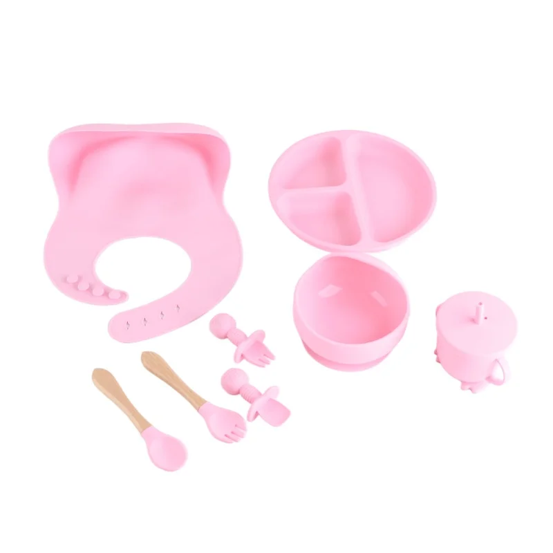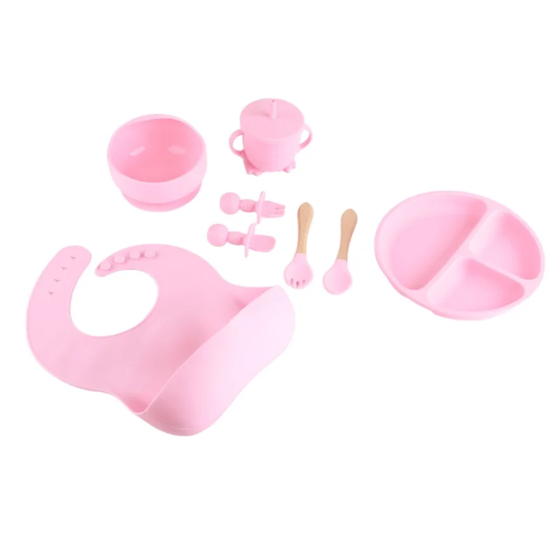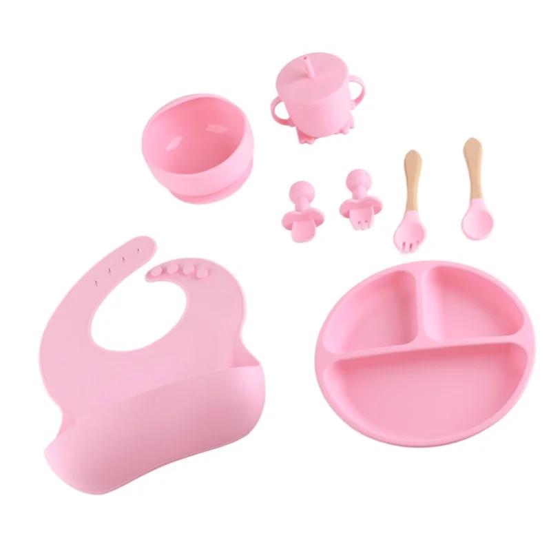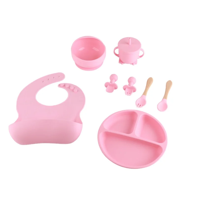 Comprar Juego de alimentación de bebé de silicona, babero, plato de succión, cuenco, tenedor, cuchara, taza de paja, suministros de alimentación para destete de bebé, color rosa, 8 Uds.