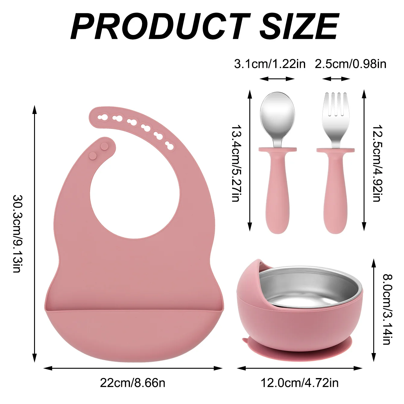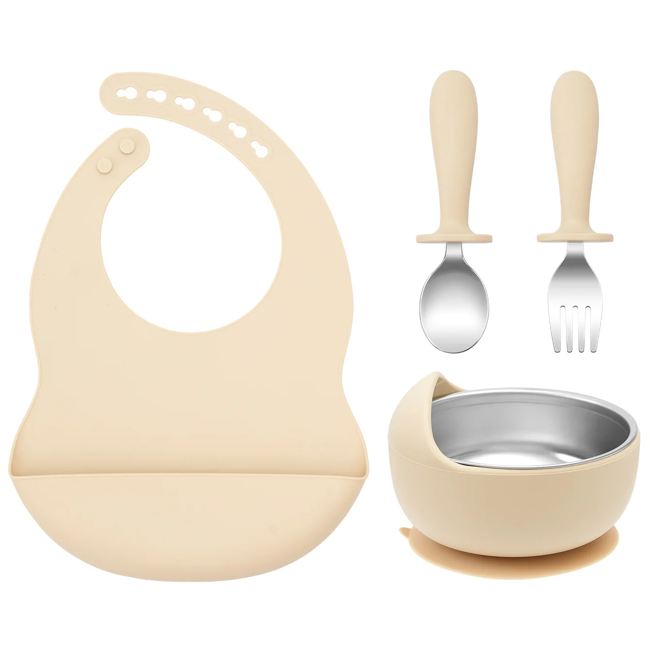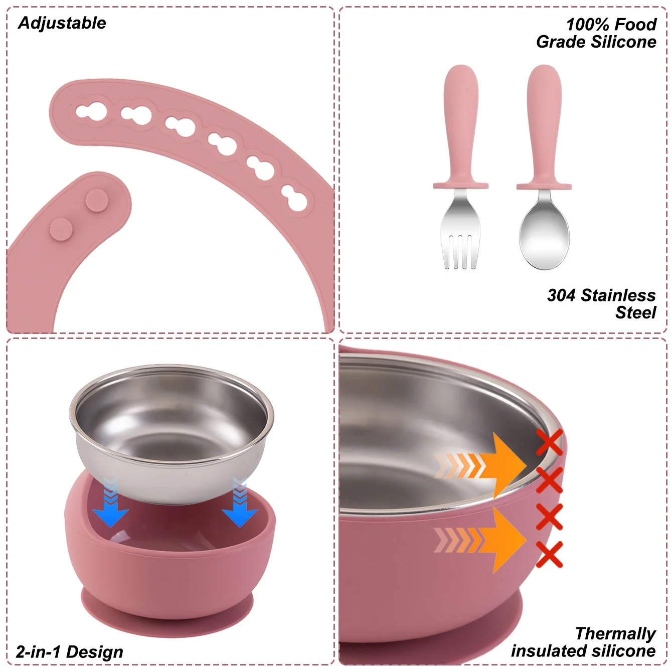 Juego de alimentación de silicona de acero inoxidable para niños pequeños, cuenco con ventosa desmontable, tenedor de entrenamiento sin BPA, cuchara, cubiertos, babero impermeable, 4 Uds.
