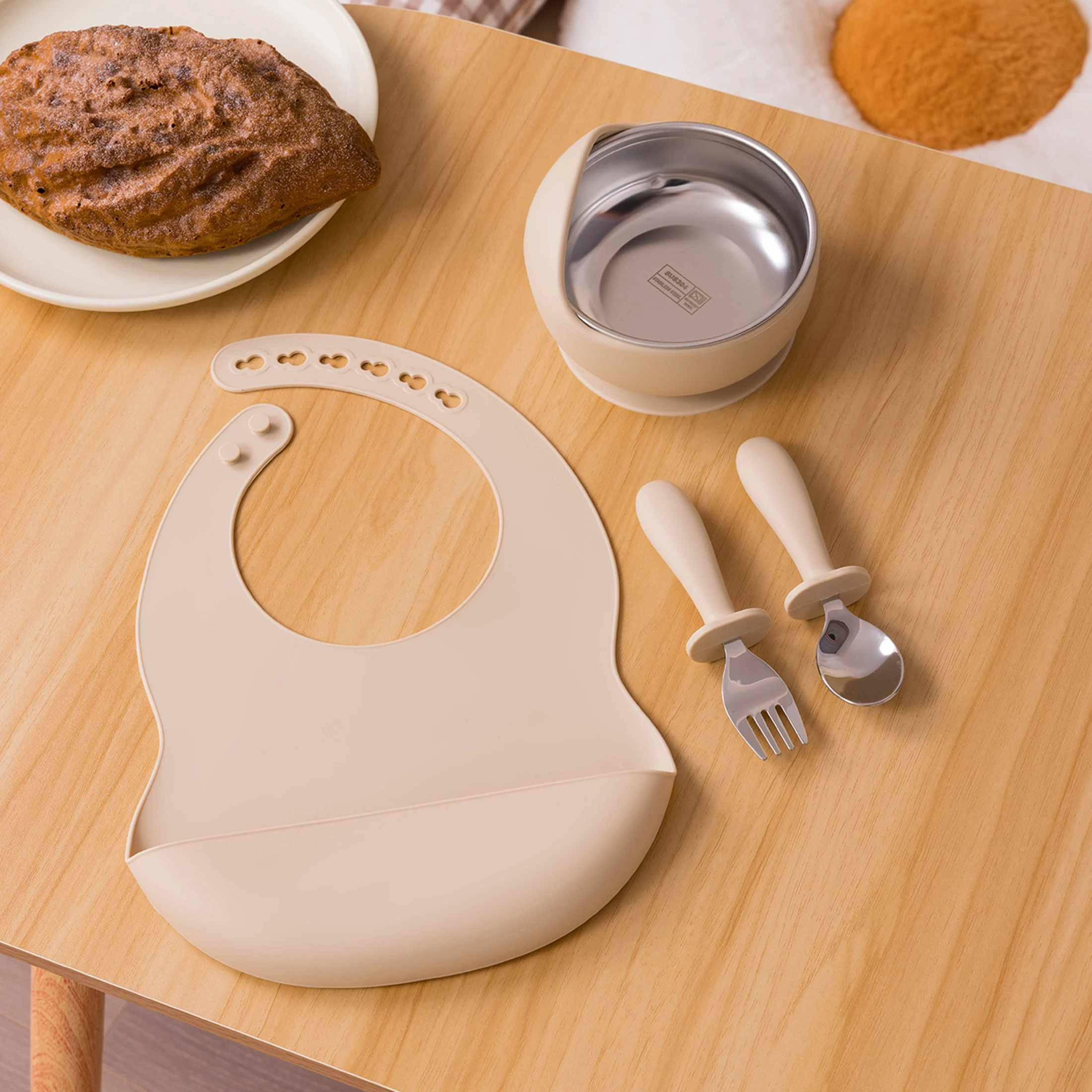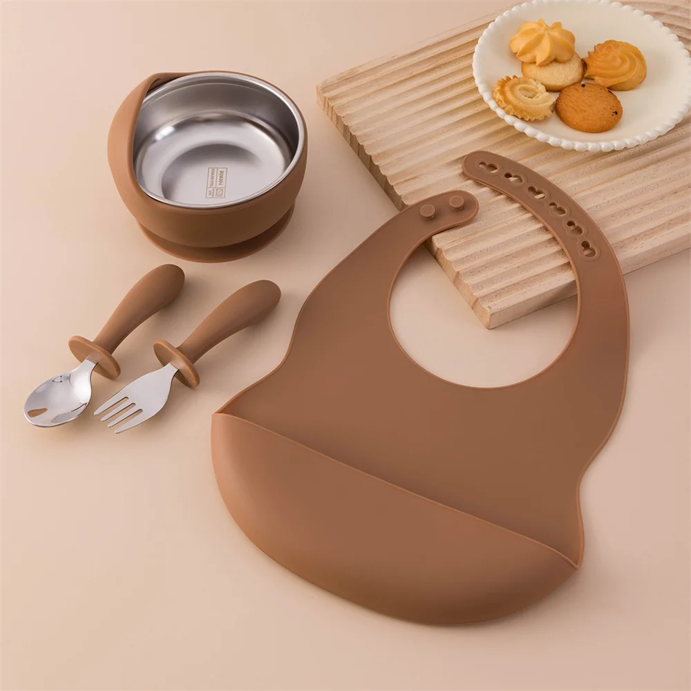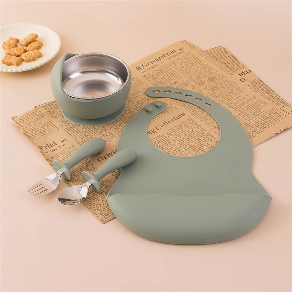 Juego de alimentación de silicona de acero inoxidable para niños pequeños, cuenco con ventosa desmontable, tenedor de entrenamiento sin BPA, cuchara, cubiertos, babero impermeable, 4 Uds.