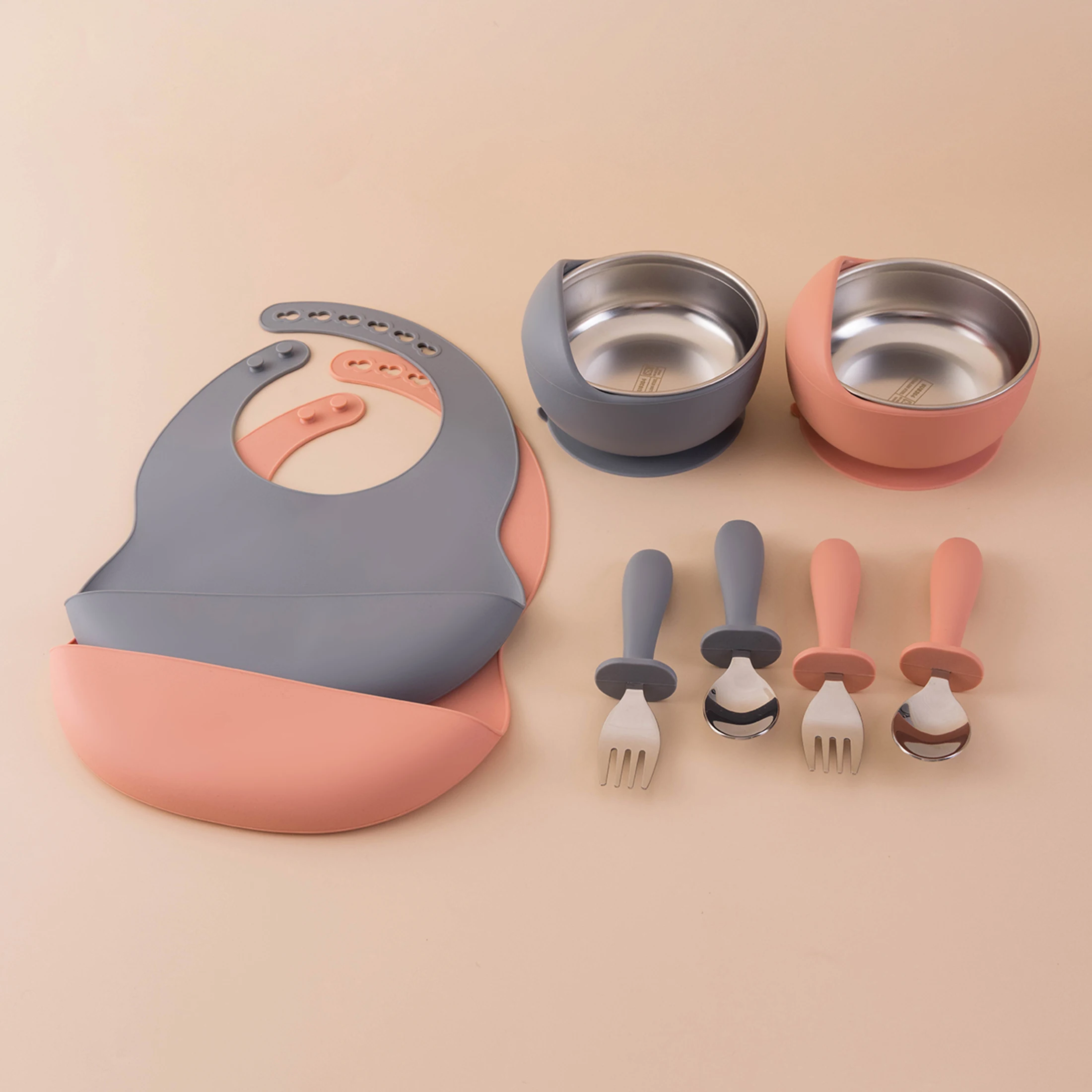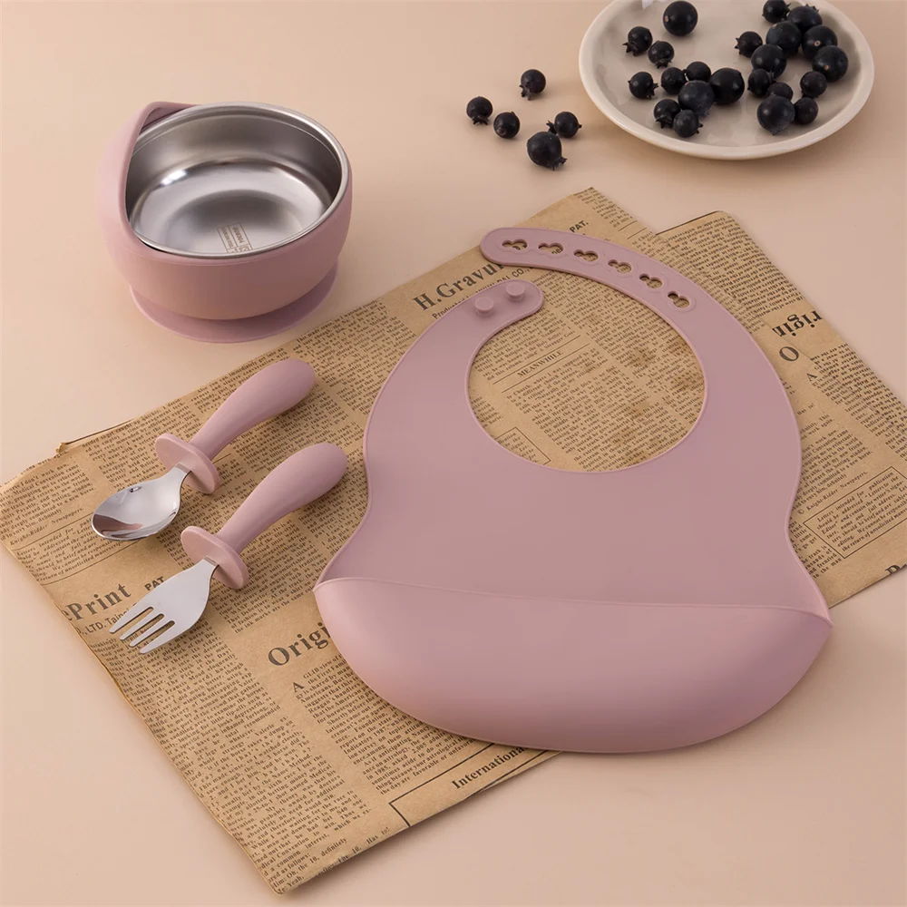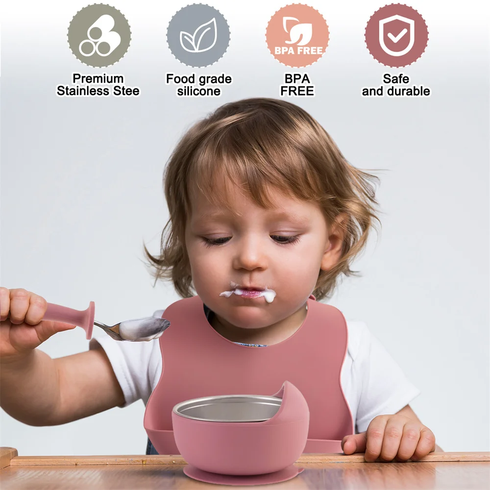 Comprar Juego de alimentación de silicona de acero inoxidable para niños pequeños, cuenco con ventosa desmontable, tenedor de entrenamiento sin BPA, cuchara, cubiertos, babero impermeable, 4 Uds.