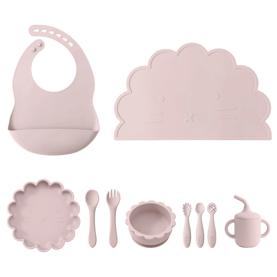 Juego de Silicona para Alimentación de Bebé, Platos con Forma de León de Dibujos Animados, Cuchara con Ventosa, Tenedor, Taza de Babero Portátil, Juego de Cena de Bebé, Plato de 10 piezas