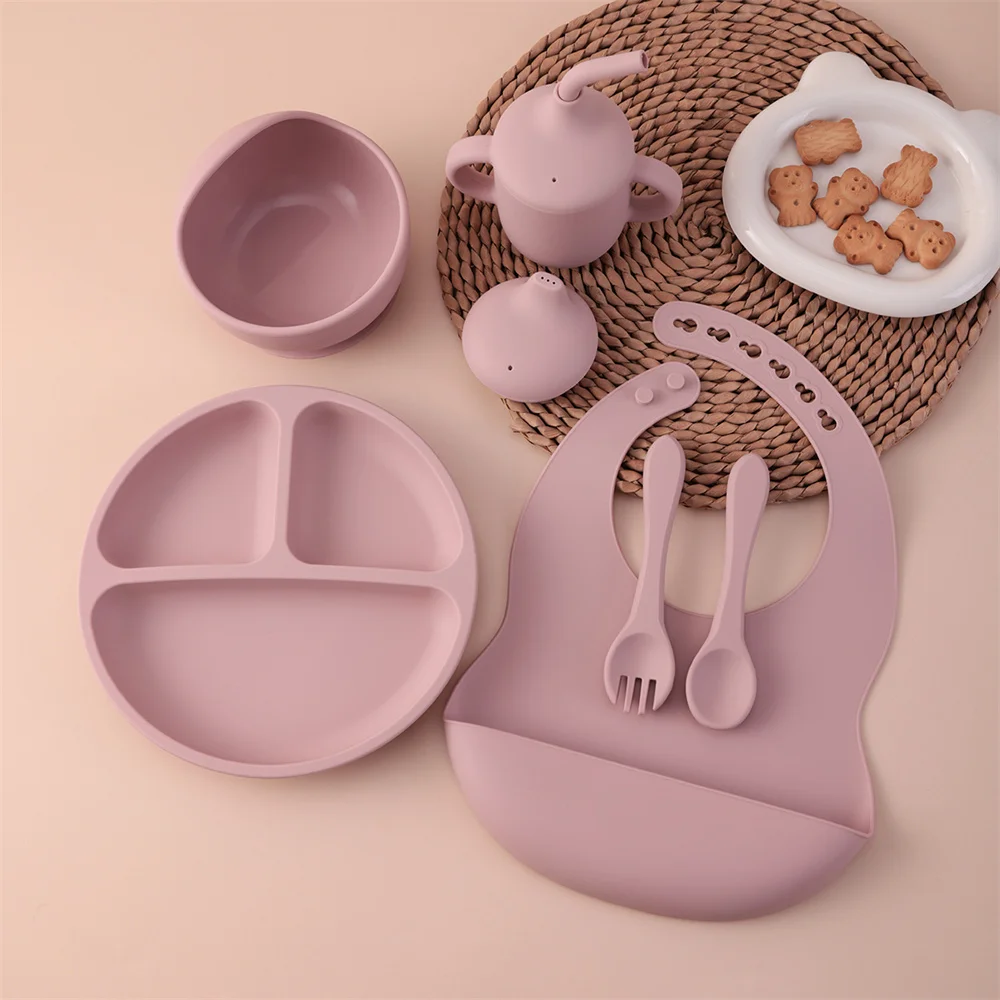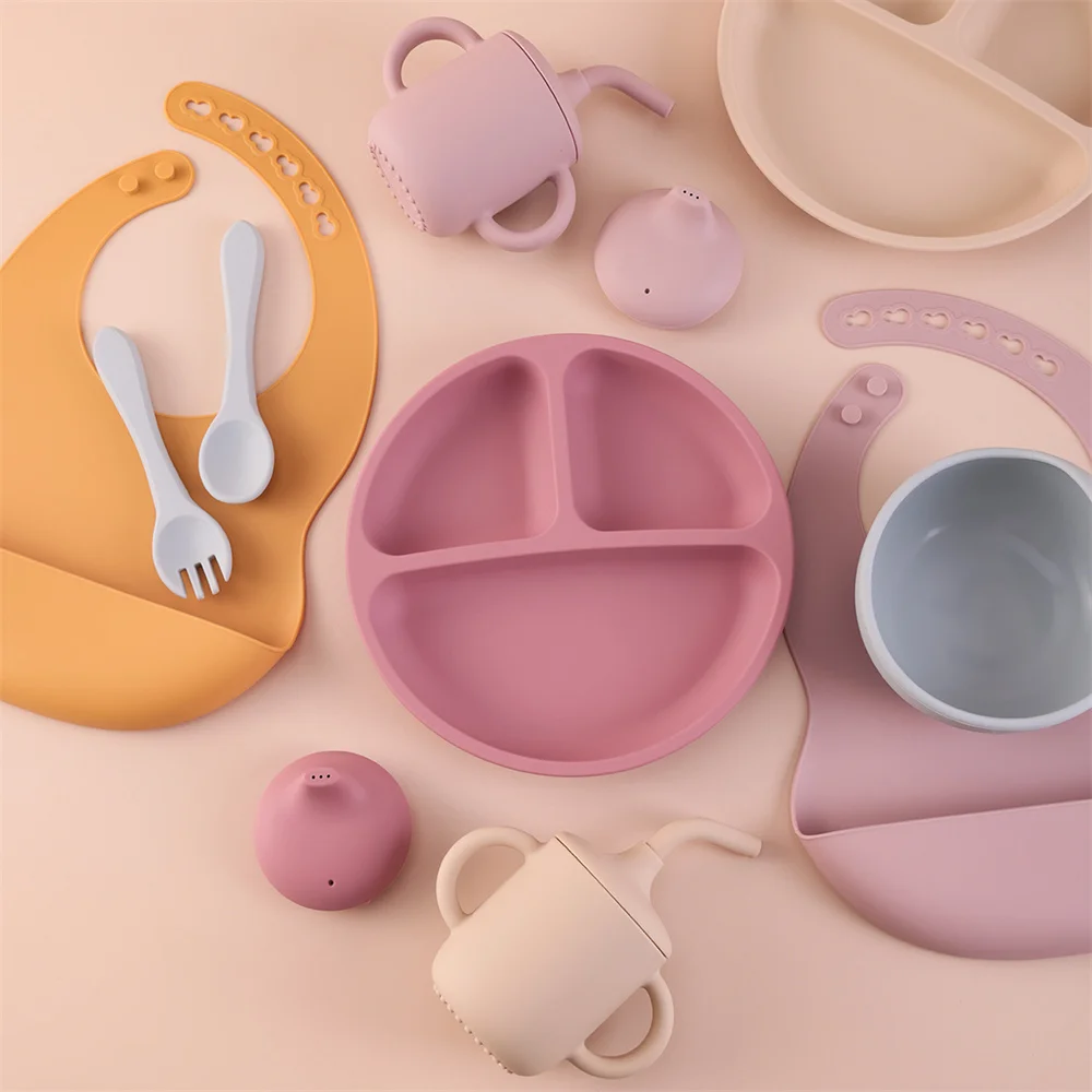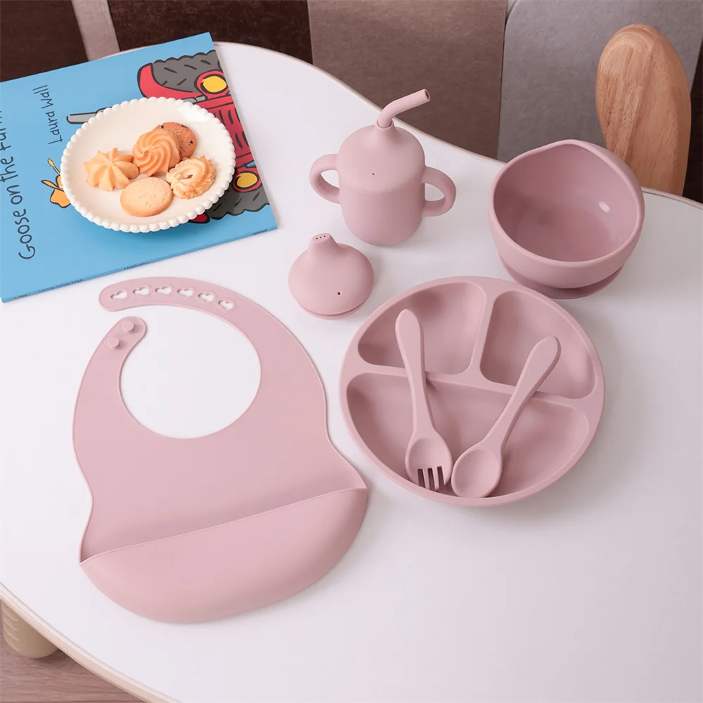 Juego de alimentación de silicona para niños, 6 uds., platos divididos, taza para sorber, cubiertos para comer, cuenco de succión fuerte, juego de vajilla sin BPA