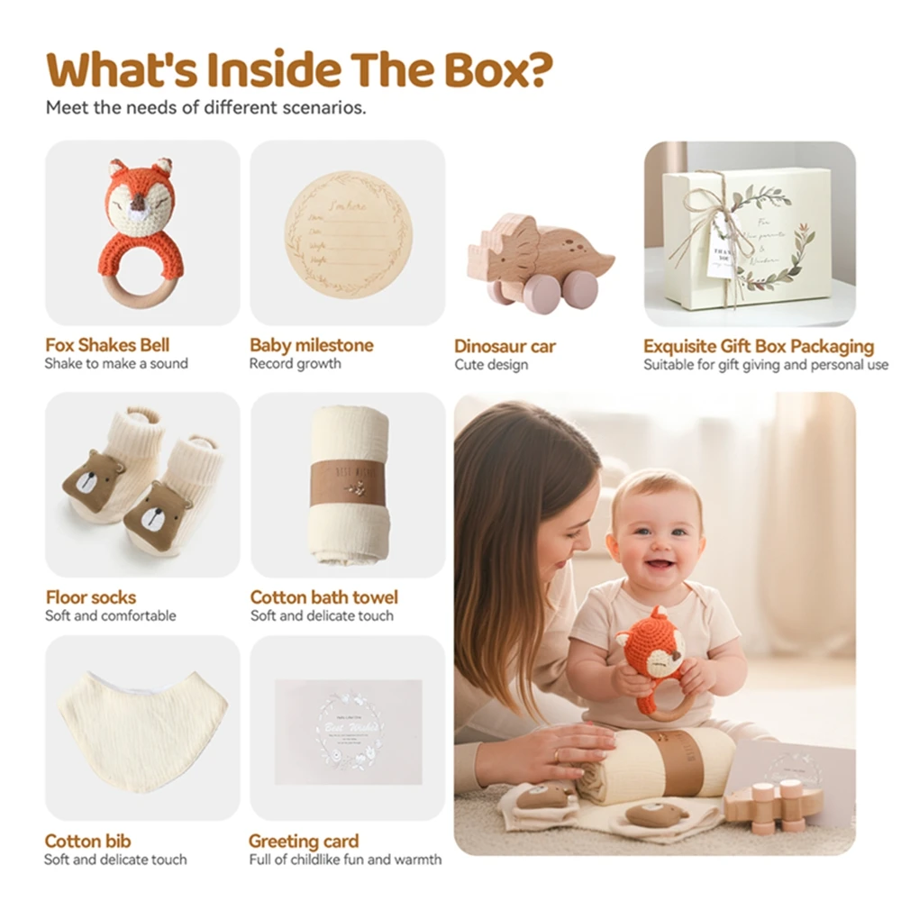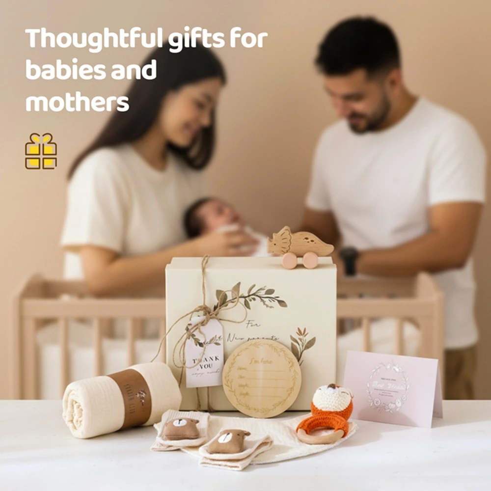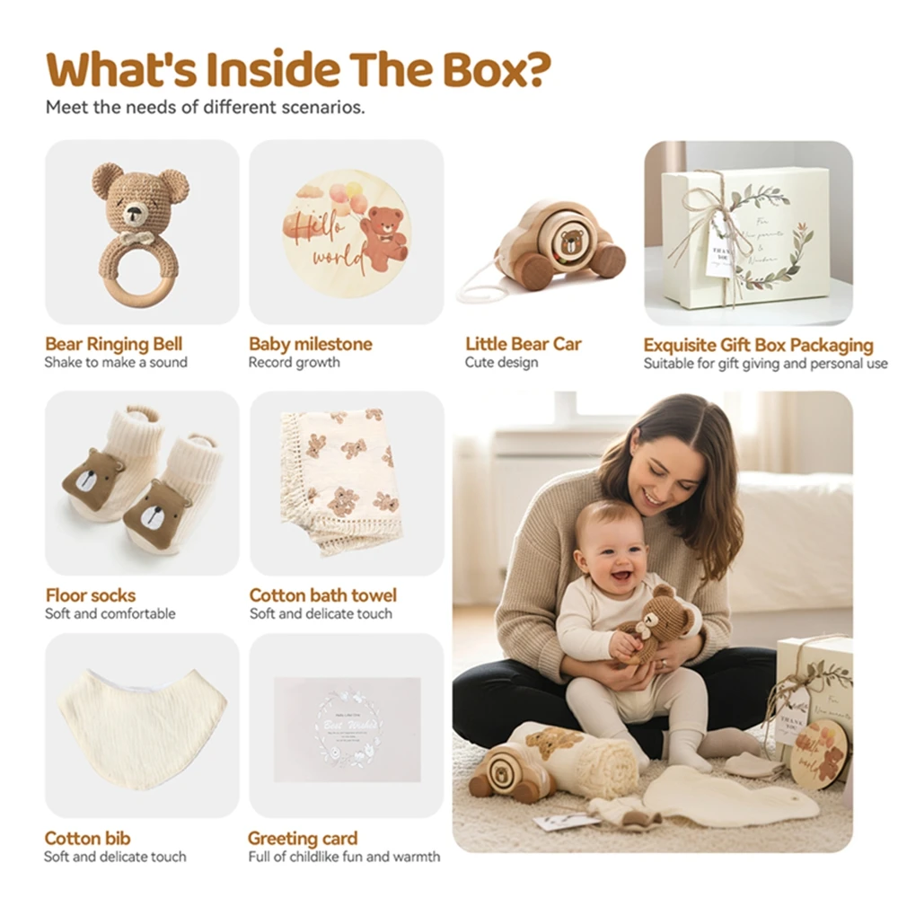 Juego de baño para bebé Let's Make, toalla de algodón, coche de juguete, sonajero de ganchillo, tarjetas de hito para bebé, zapatos de bebé, regalo para recién nacido con caja de regalo