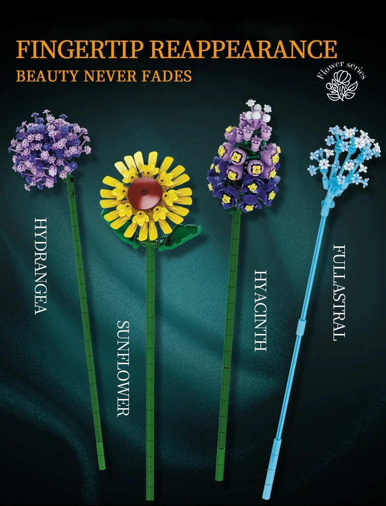 1. Exquisito preservadas ramo de flores: nuestro producto único combina la belleza de las flores preservadas con la diversión de los bloques de construcción. Cada bloque está cuidadosamente elaborado para parecerse a un girasol o gypsophila, creando un impresionante ramo de flores que nunca se marchitará.