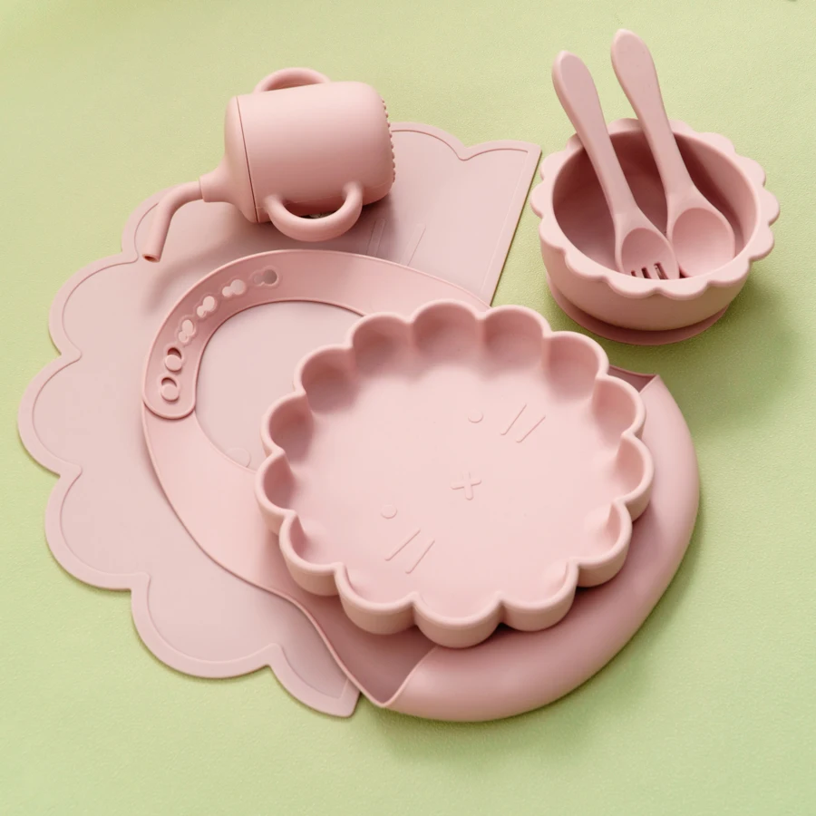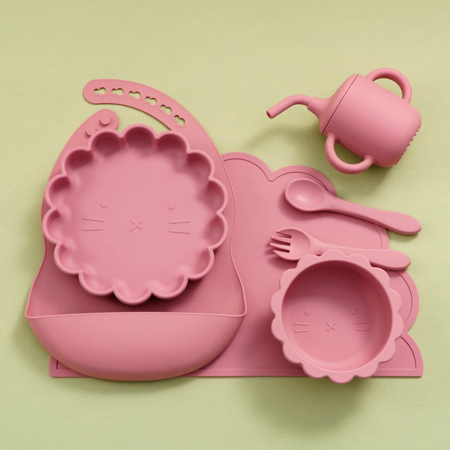 Juego de cena de silicona para bebé de 7 piezas, babero impermeable con forma de León, plato con ventosa, cuchara suave, tenedor, taza portátil, vajilla para bebé
