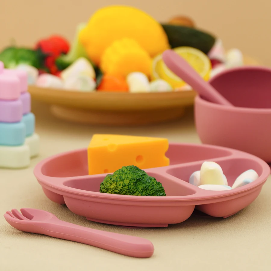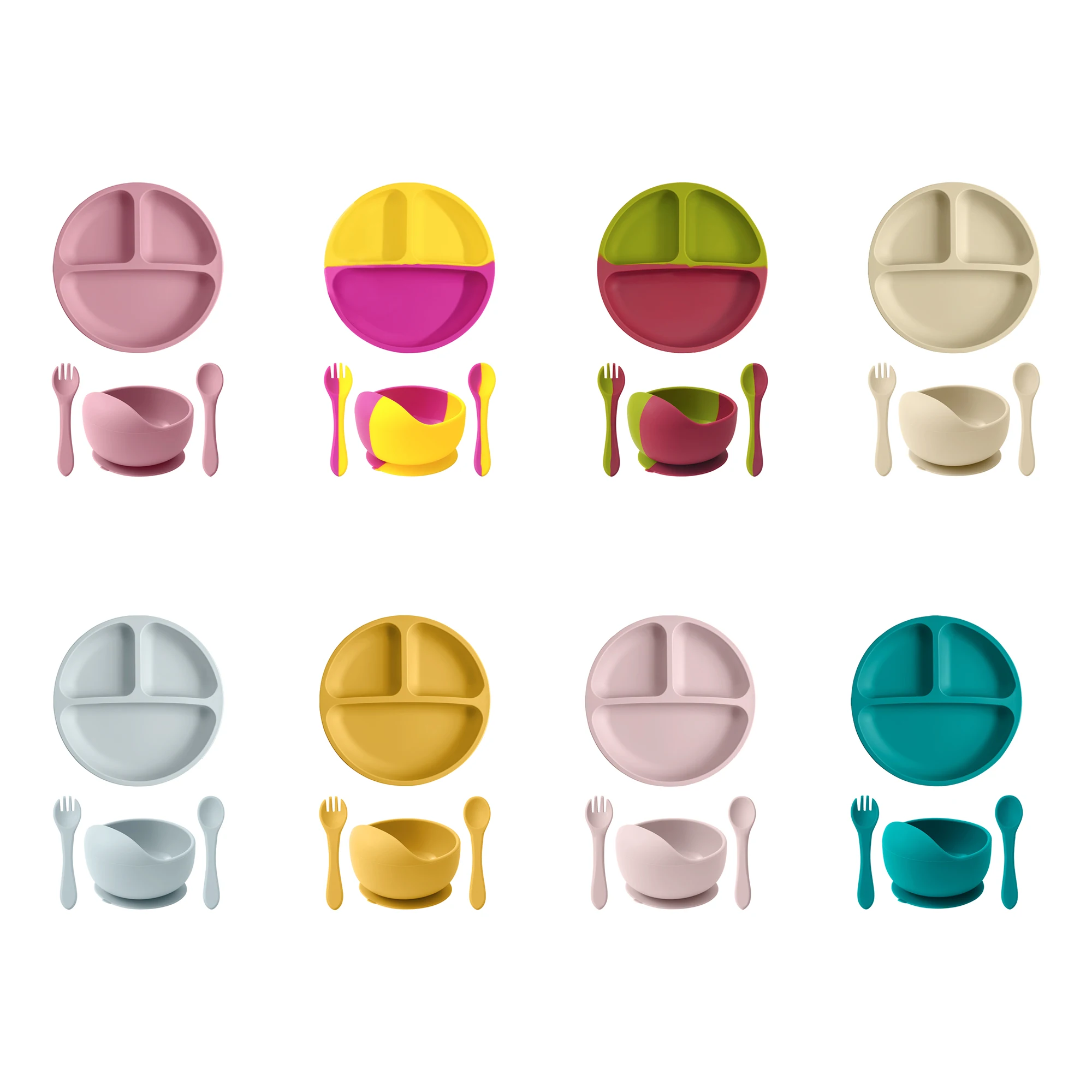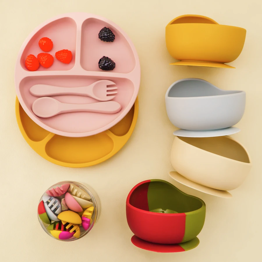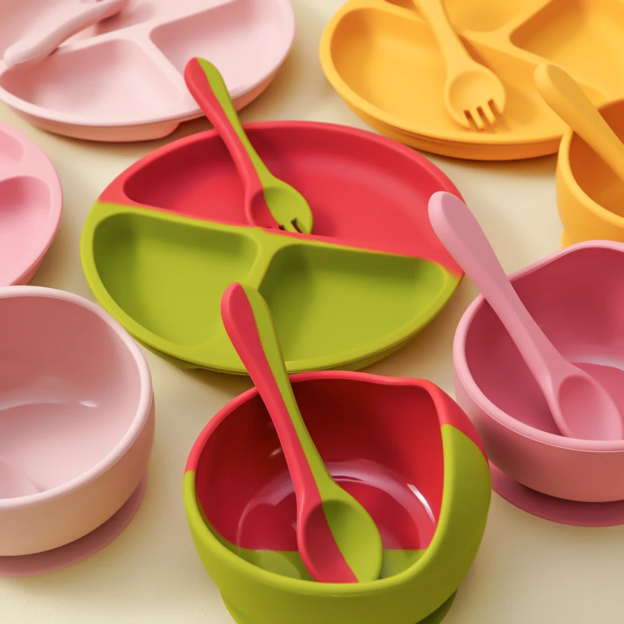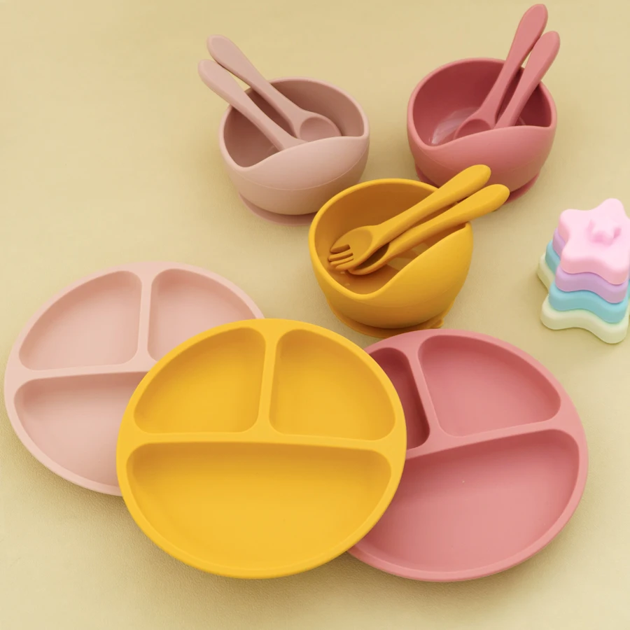 Juegos de cena de silicona para bebé, plato de contraste de Color, cuenco de succión, cuchara de entrenamiento, tenedor, juegos de vajilla coloridos para bebé, 4 Uds.