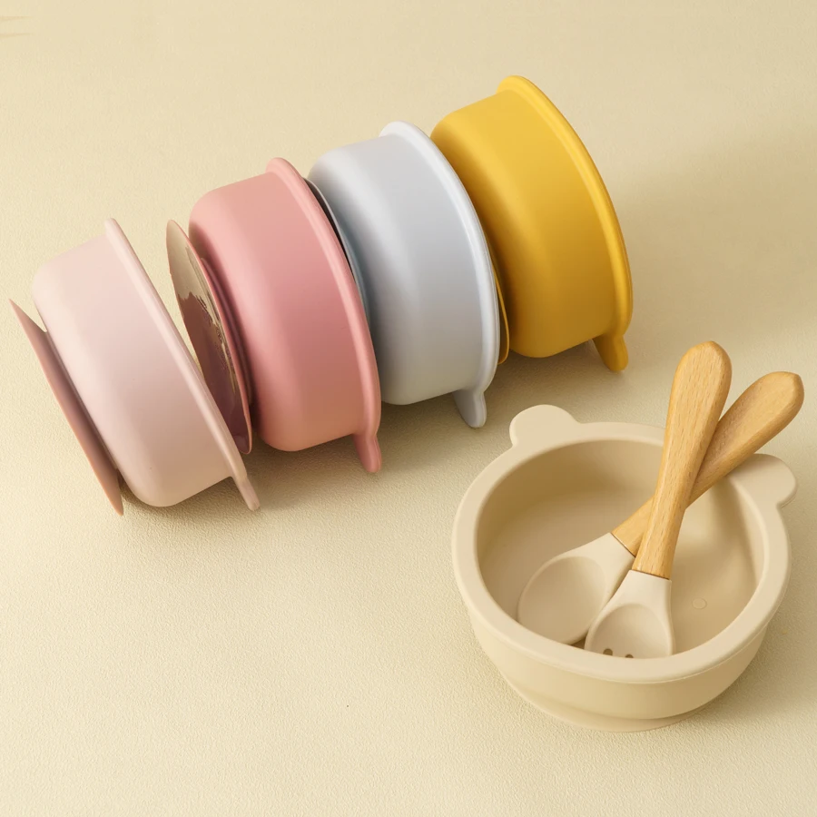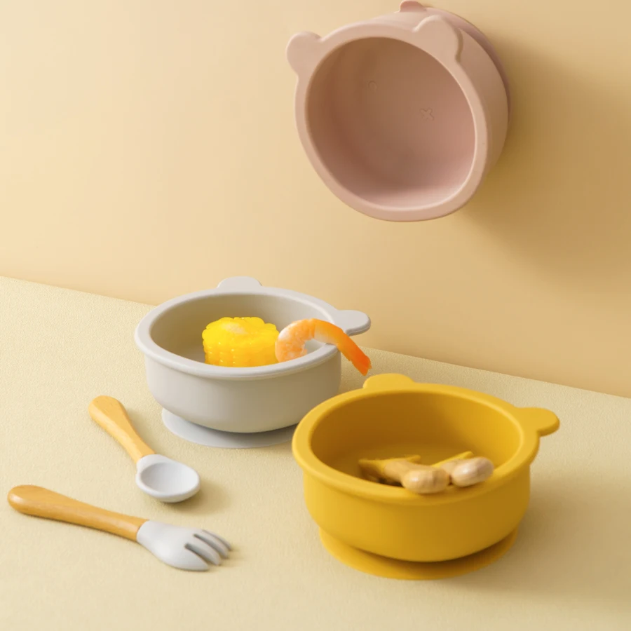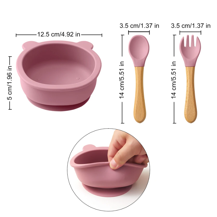 Juego de cena de silicona para bebé de 3 piezas, cuenco con succión, mango de madera, cuchara, tenedor, entrenamiento, aprendizaje, cosas para bebé, vajilla antideslizante para bebé
