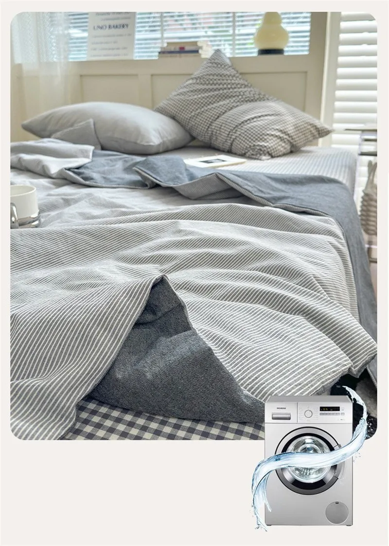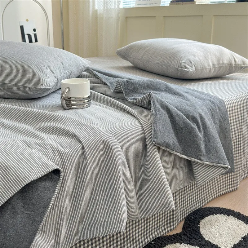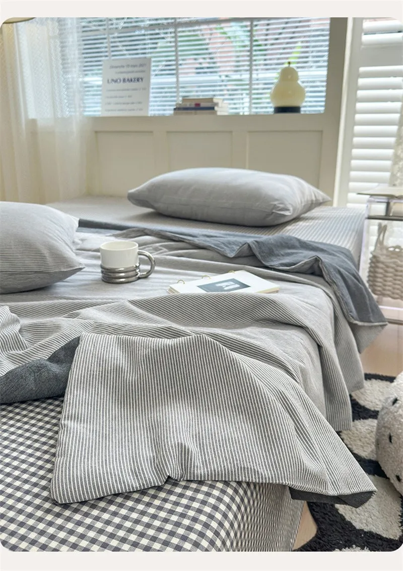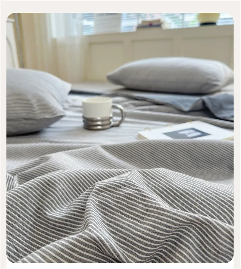 Conjunto de cuatro piezas de algodón a rayas, lenzuero de cama y edredón con fundas de almohada, edredón transpirable agradable para la piel, funda de cama