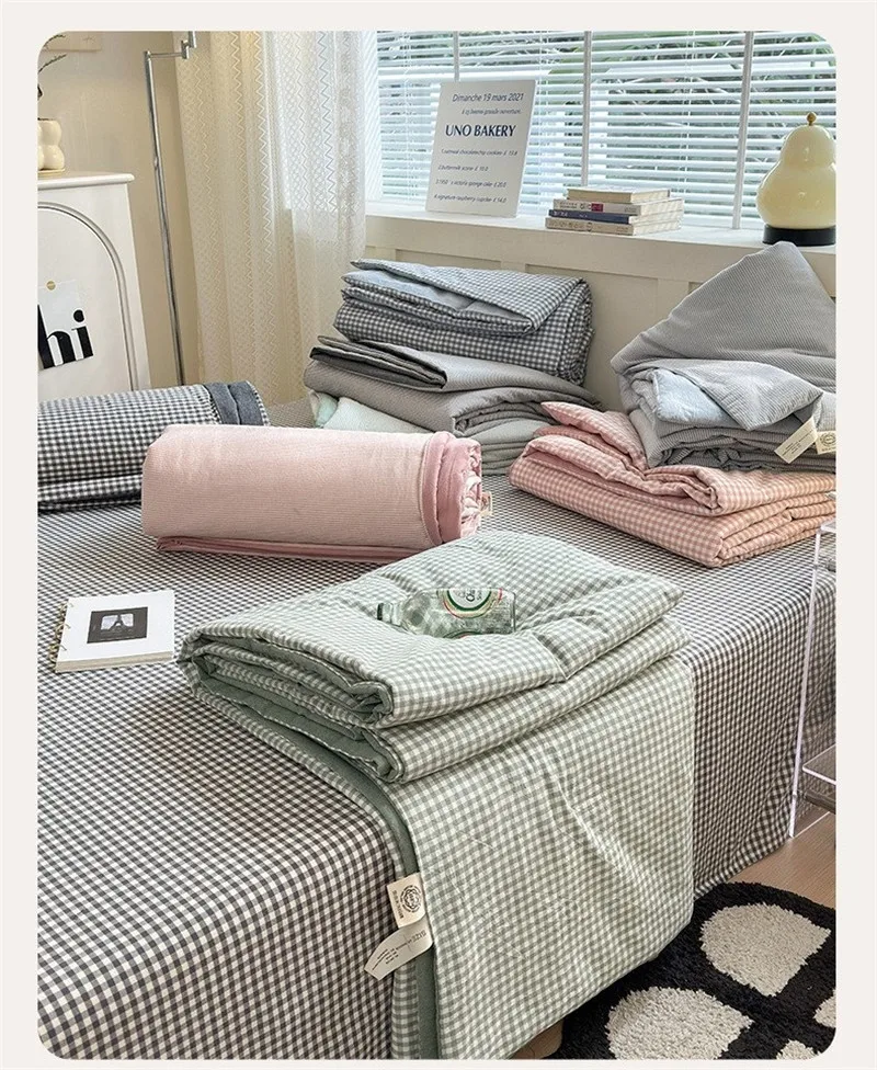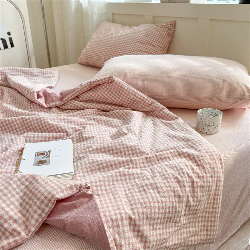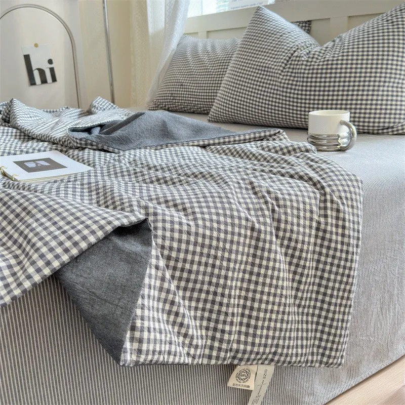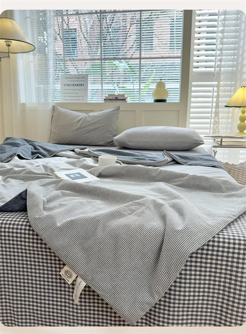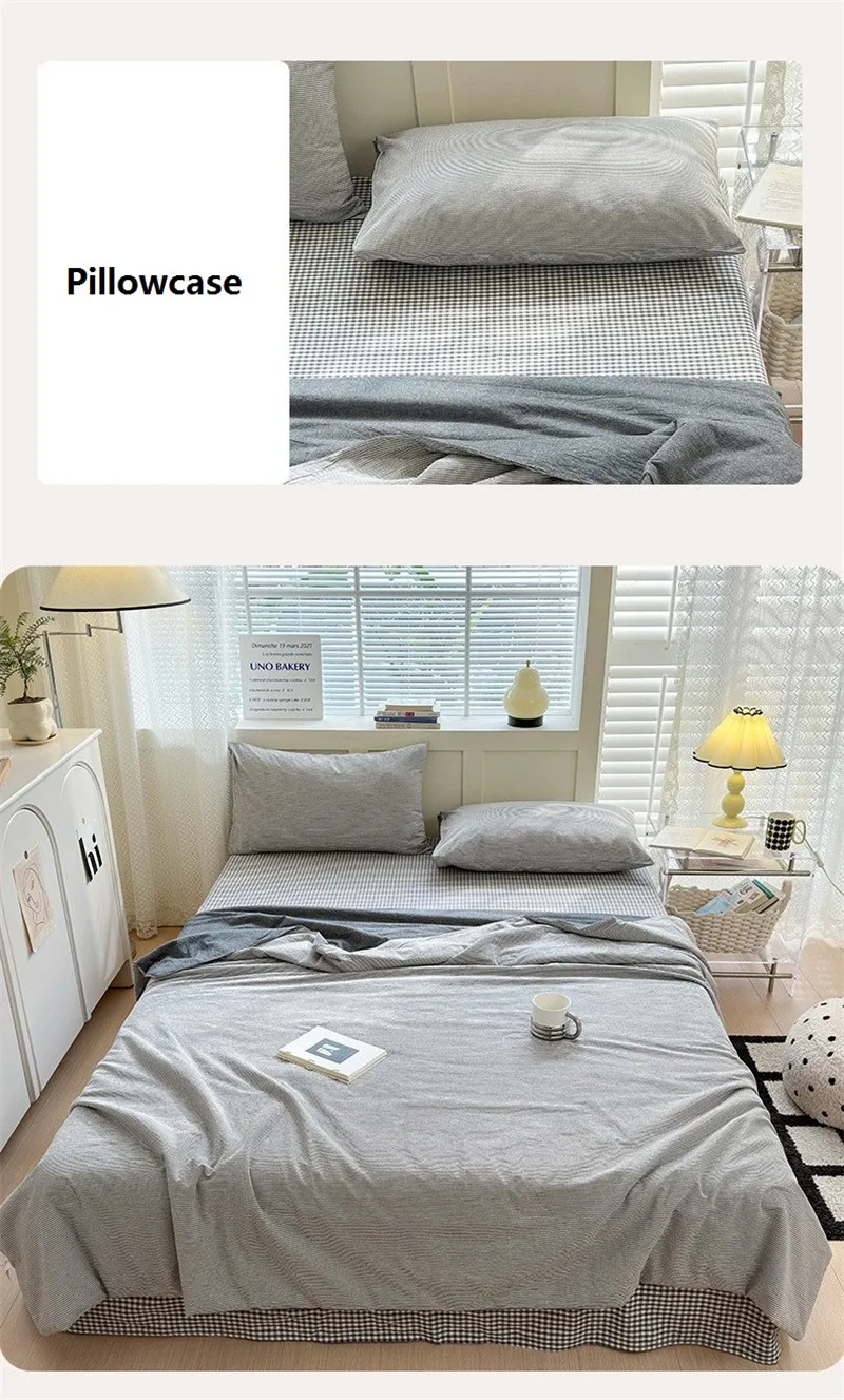Conjunto de cuatro piezas de algodón a rayas, lenzuero de cama y edredón con fundas de almohada, edredón transpirable agradable para la piel, funda de cama