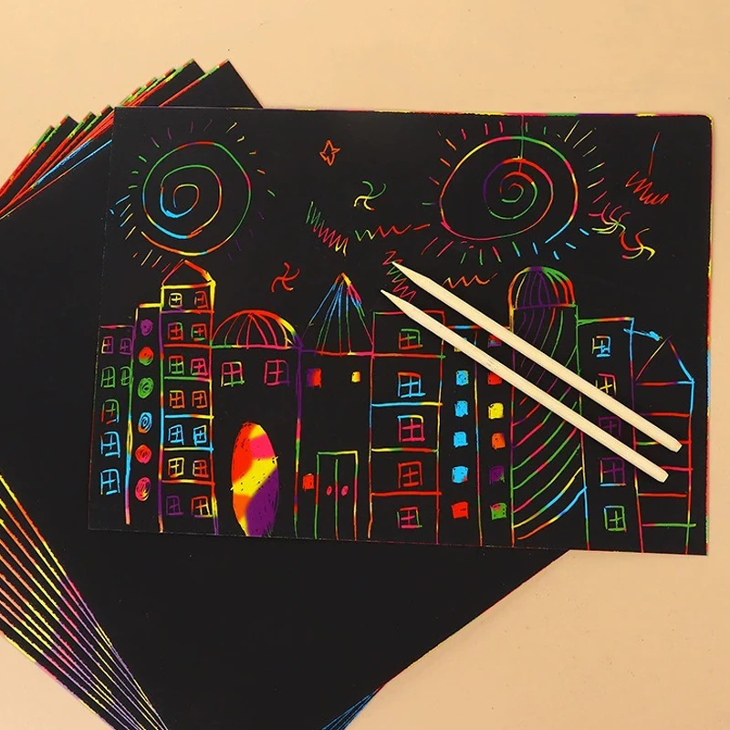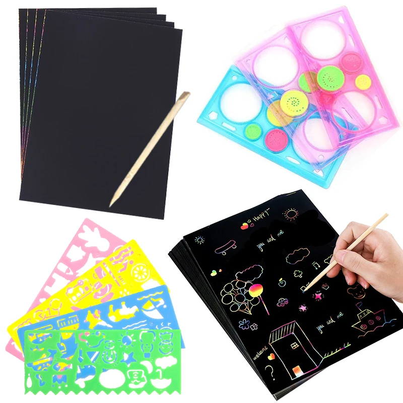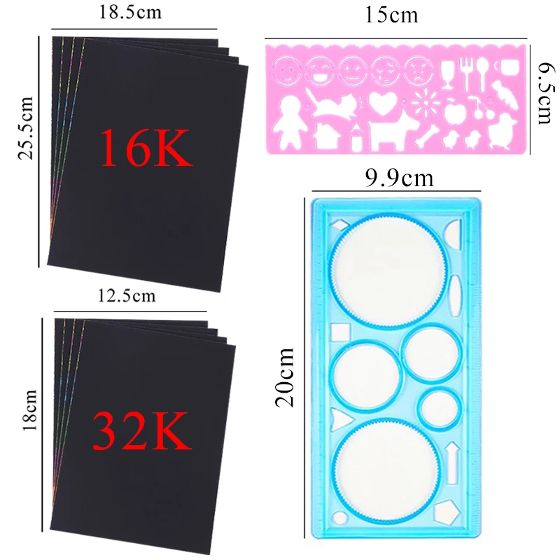 Comprar Juego de dibujo de rasguño mágico de arcoíris, 16K, 32K, papeles para rascar, palo de madera, regla de espirógrafo, regla de pintura, arte divertido, regalos de grafiti ZYF