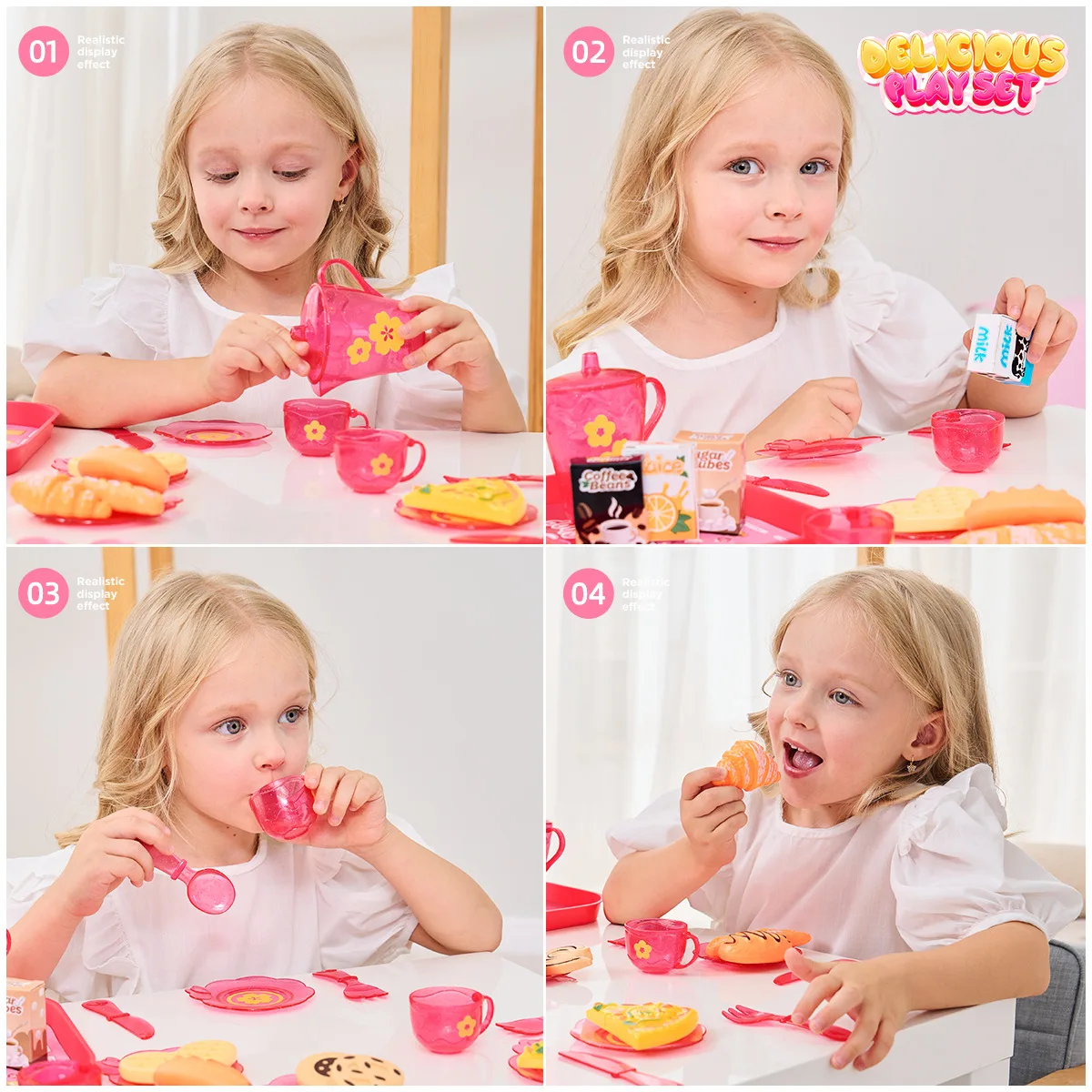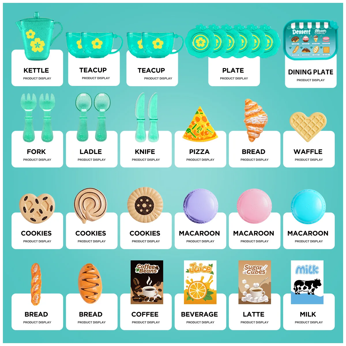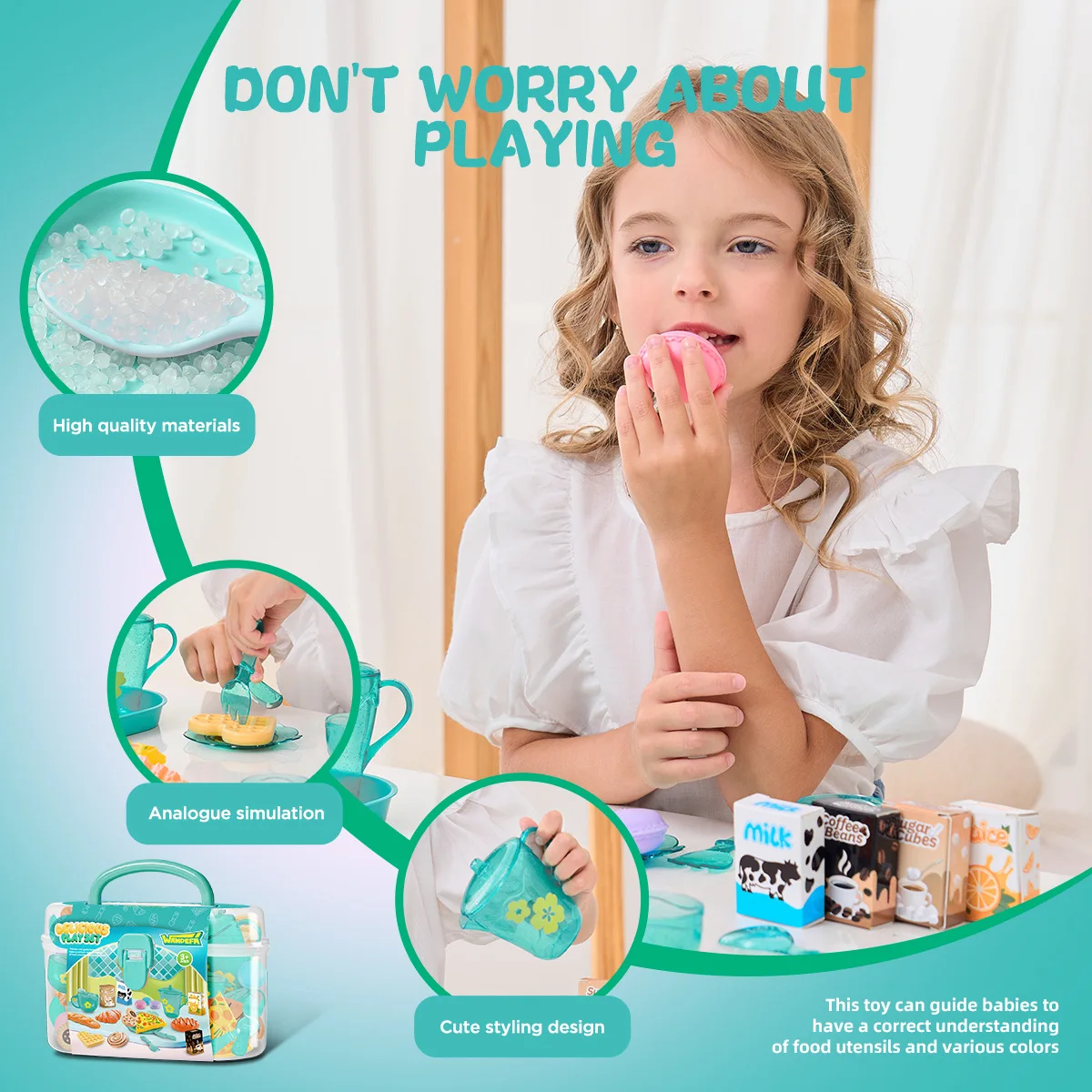4.Fácil de organizar: cada juego de 25 juguetes, desde teteras hasta refrigerios, viene en una maleta portátil, lo que facilita su almacenamiento y transporte para los niños, promoviendo hábitos de orden