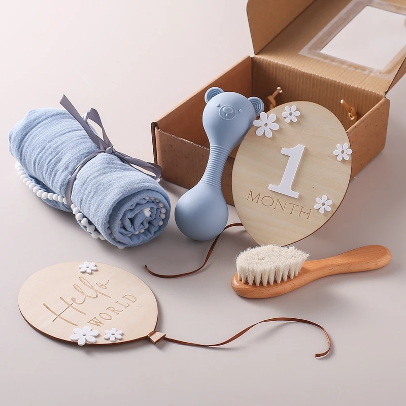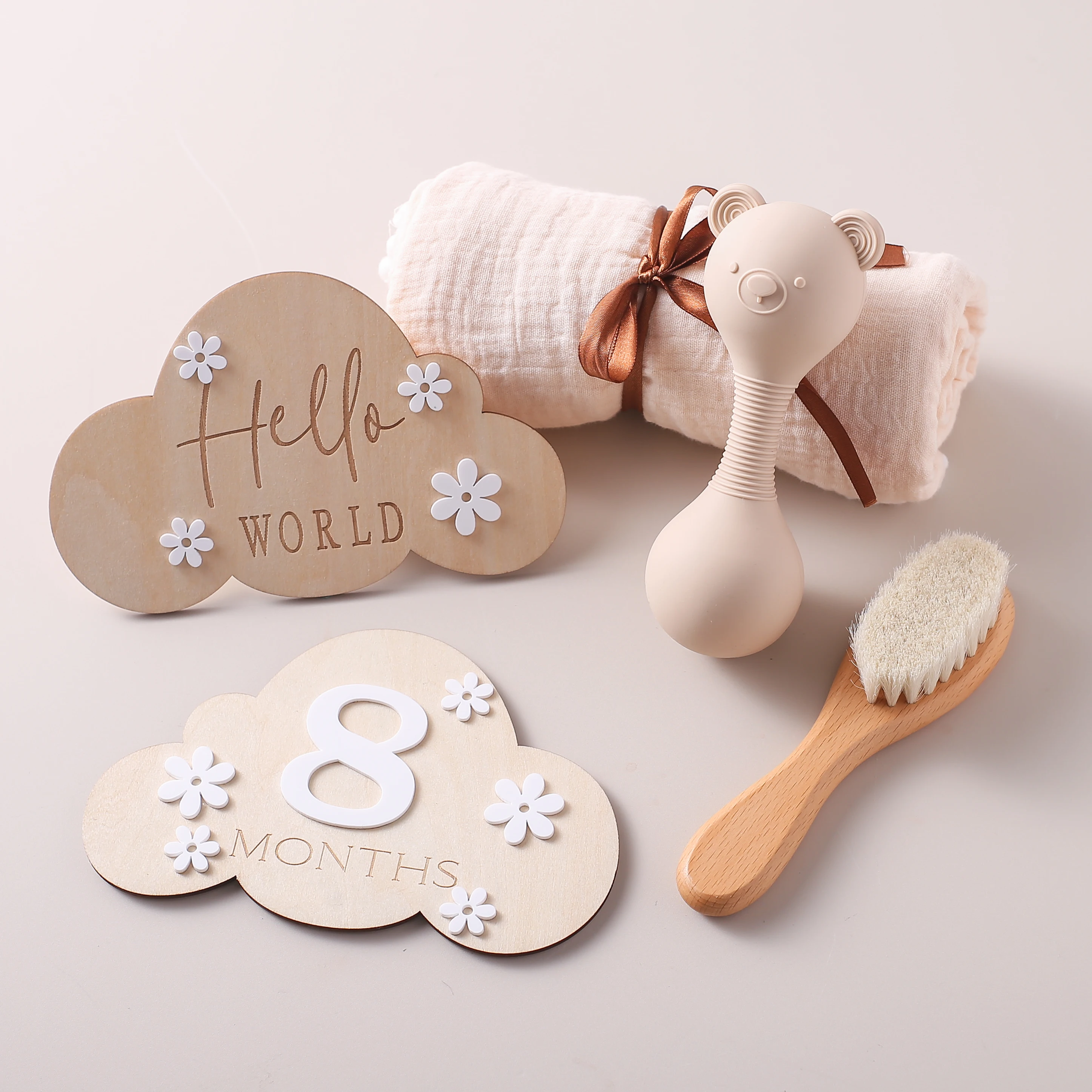 5 unid/set Baby Shower regalos Set silicona sonajero juguetes cepillo de madera oso dentición juguetes para bebés 0 a 3 meses nacimiento hito tarjeta