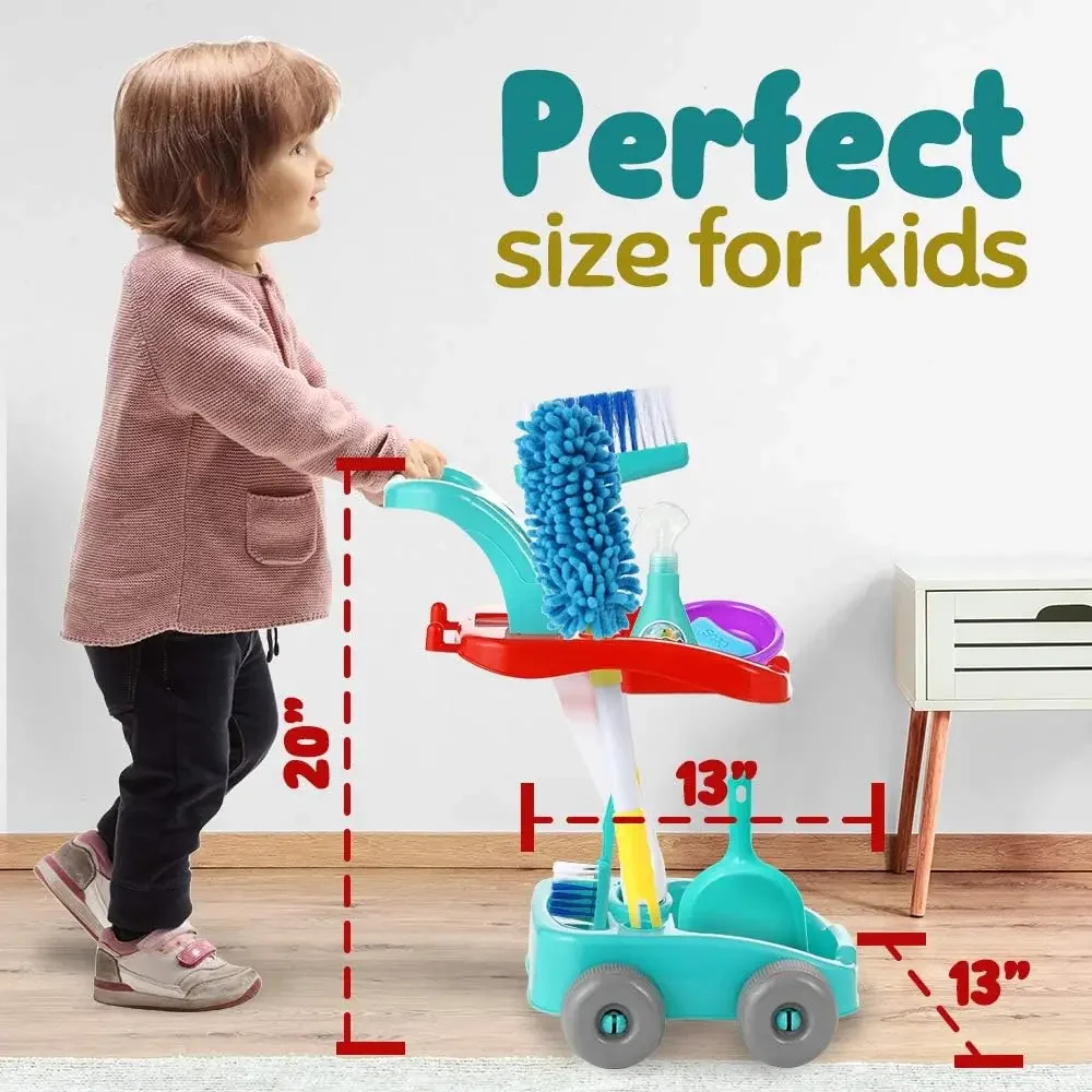 CARRO DE LIMPIEZA MOVIL, ALTURA MODERADA PARA NIÑOS: el carrito de limpieza es liviano con cuatro ruedas para que sus hijos puedan empujarlo fácilmente para moverse a diferentes lugares y mantener esos lugares ordenados. Sus ruedas son lisas por lo que no dañará su piso cuando se empuje el carro. Este carrito de limpieza de juguetes mide 19,68 pulgadas, lo que facilita que los niños pequeños lo alcancen. Su hijo puede poner fácilmente todas las pequeñas herramientas de limpieza en el carrito y ya puede disfrutar de la diversión sin fin de jugar a fingir limpiar.