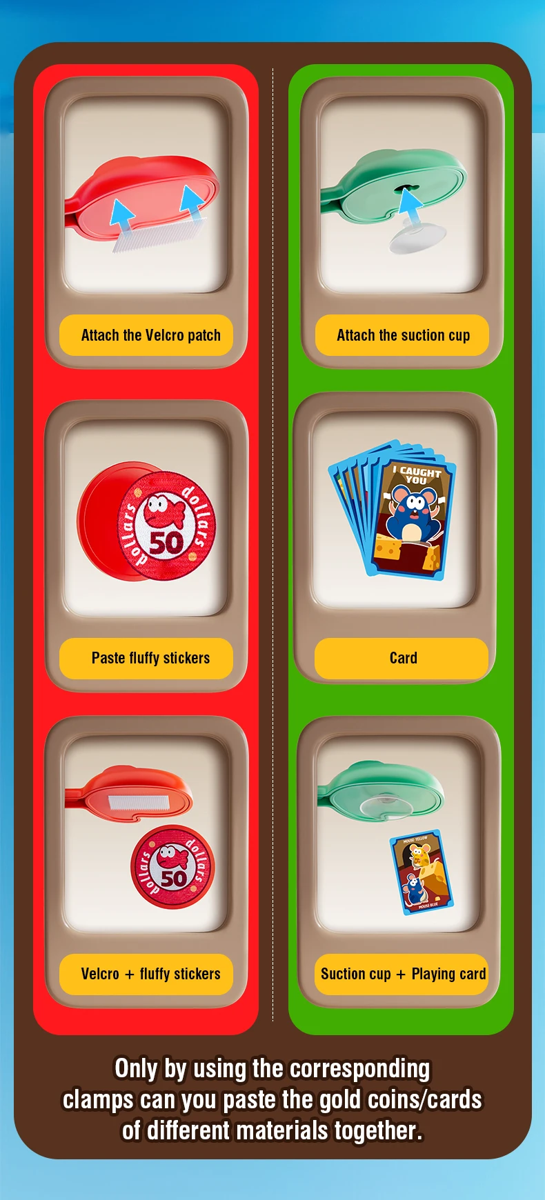2.Hay dos tipos de métodos de juego de agarre.Al colocarlo en la parte inferior de la pinza, puede pegar pegatinas de felpa y doradas.Para agarrar tarjetas, debe instalar ventosas en la pinza y usar la pinza correspondiente para pegar oro/tarjetas de diferentes materiales.
