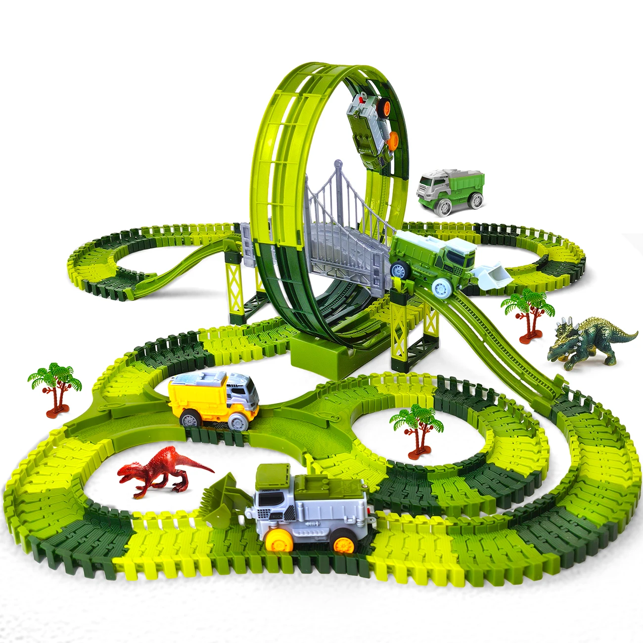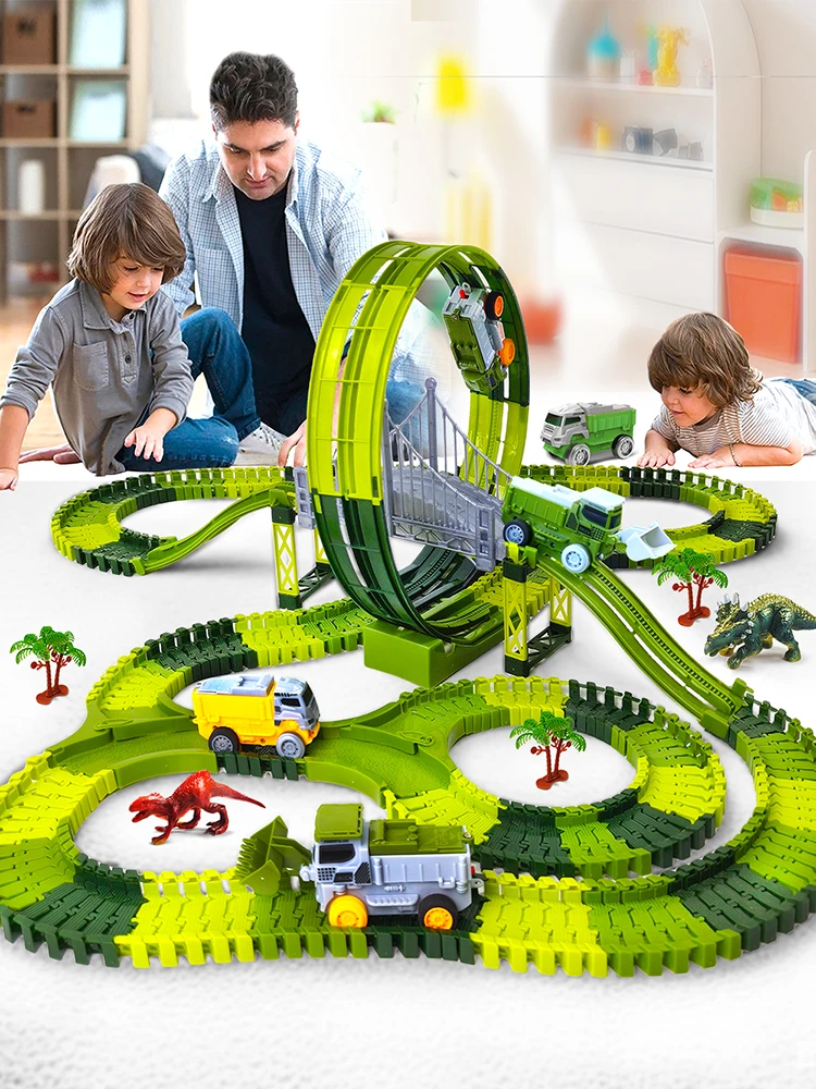 Este juego de pistas de coches eléctricos de carreras de dinosaurios es un juguete educativo que enseña a los niños sobre la ingeniería y la resolución de problemas a través del juego.