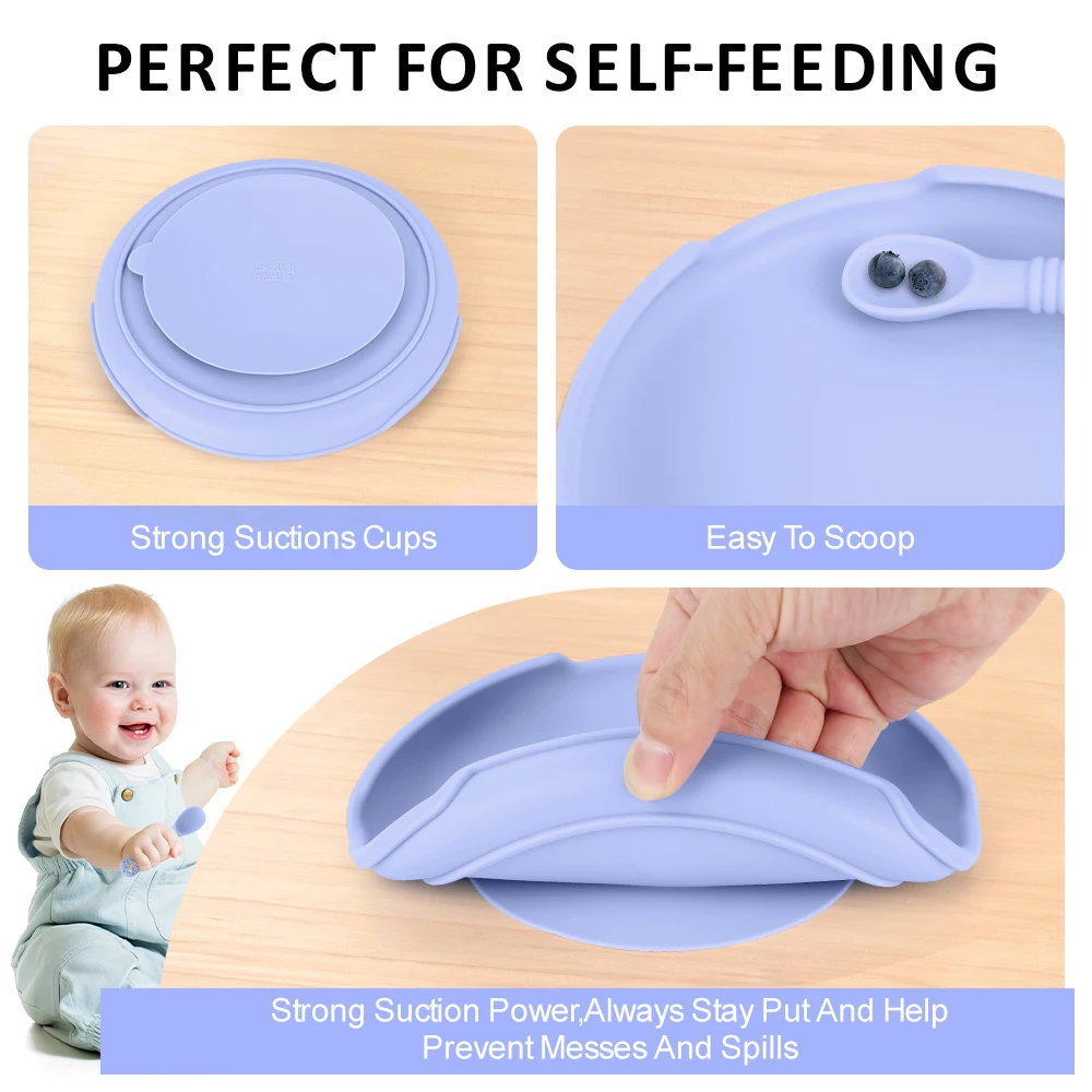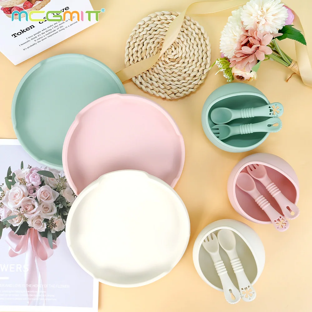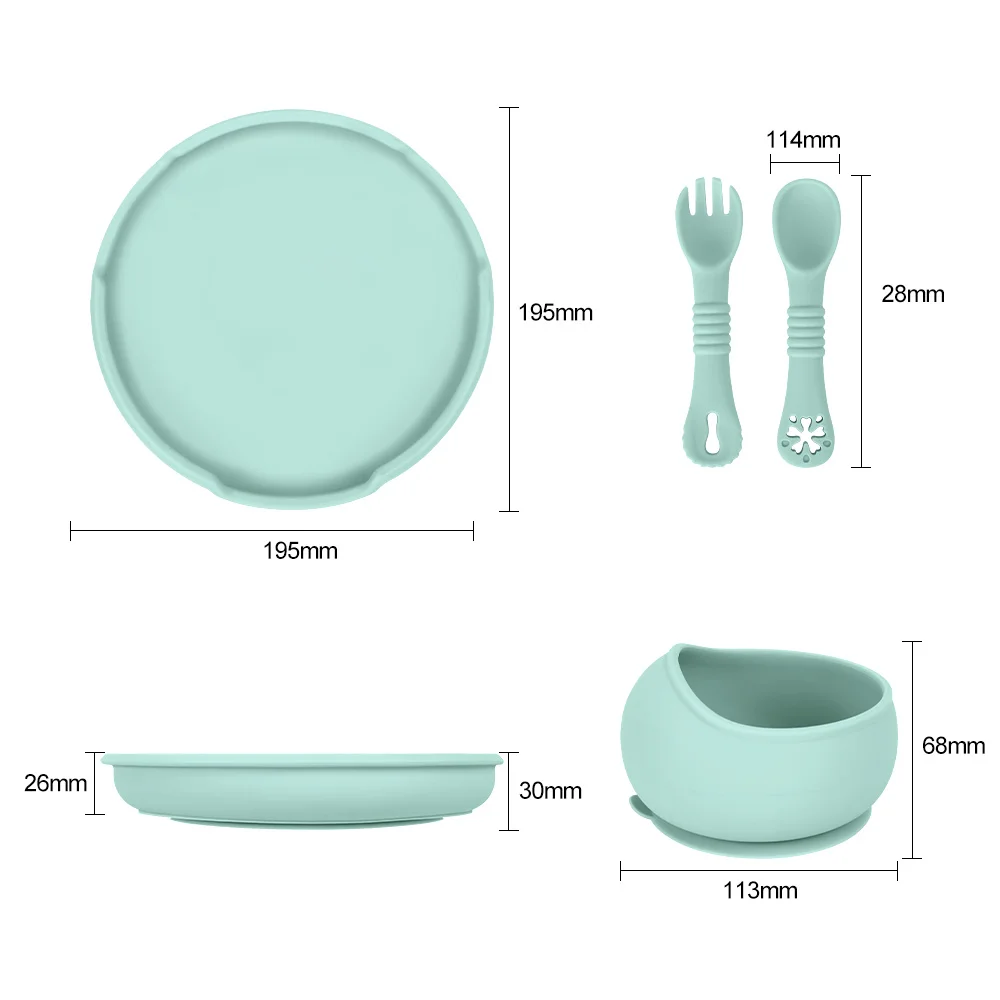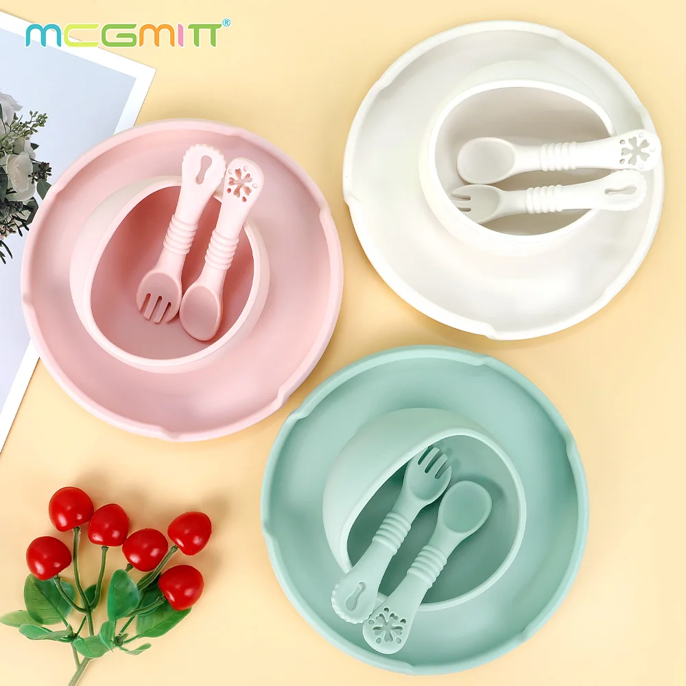 Juego de platos de silicona para bebé, vajilla para niños con ventosas, tenedor de alimentación, cucharas, cuenco de silicona, elementos esenciales para madre y bebé, 4 Uds.