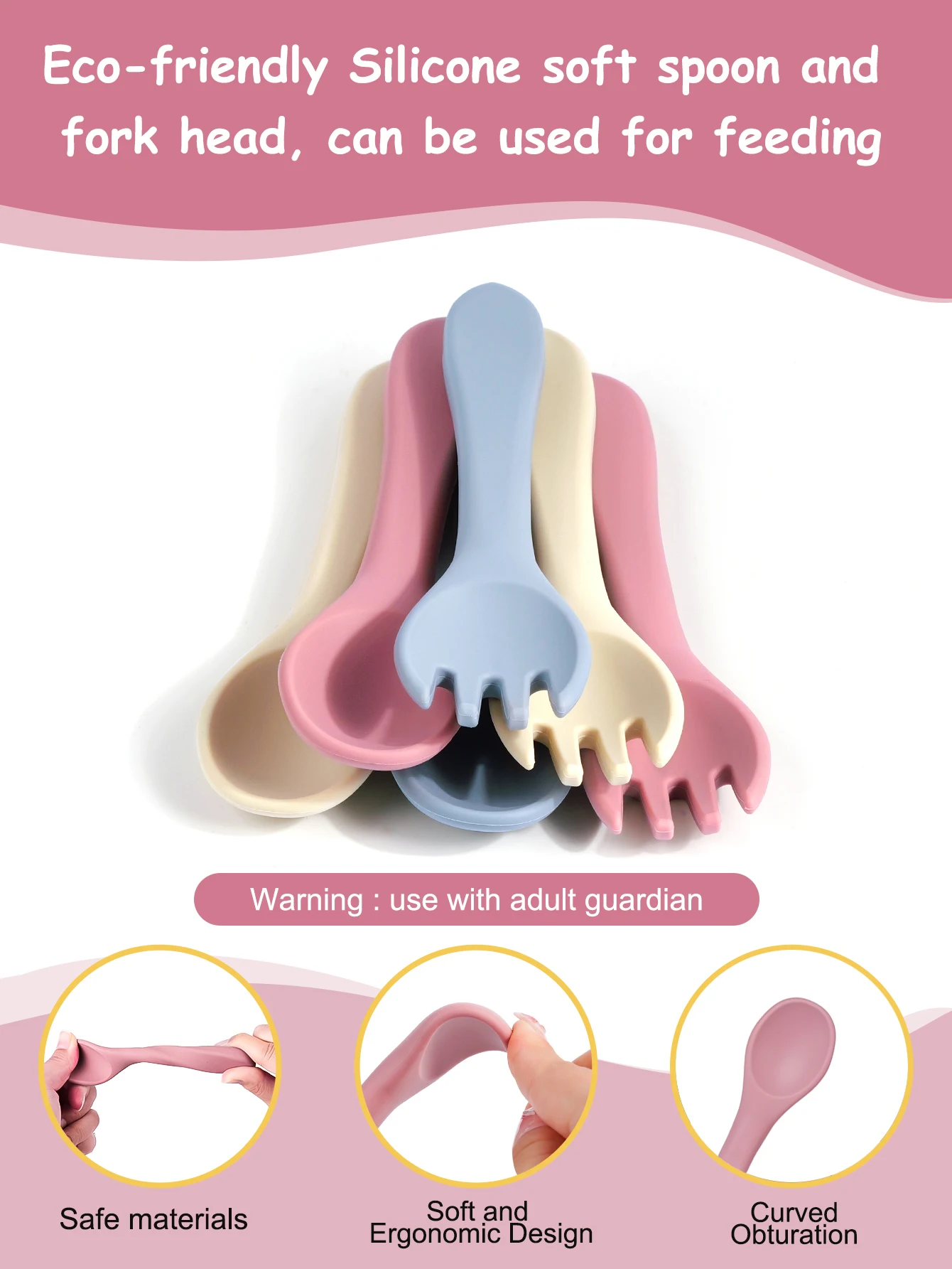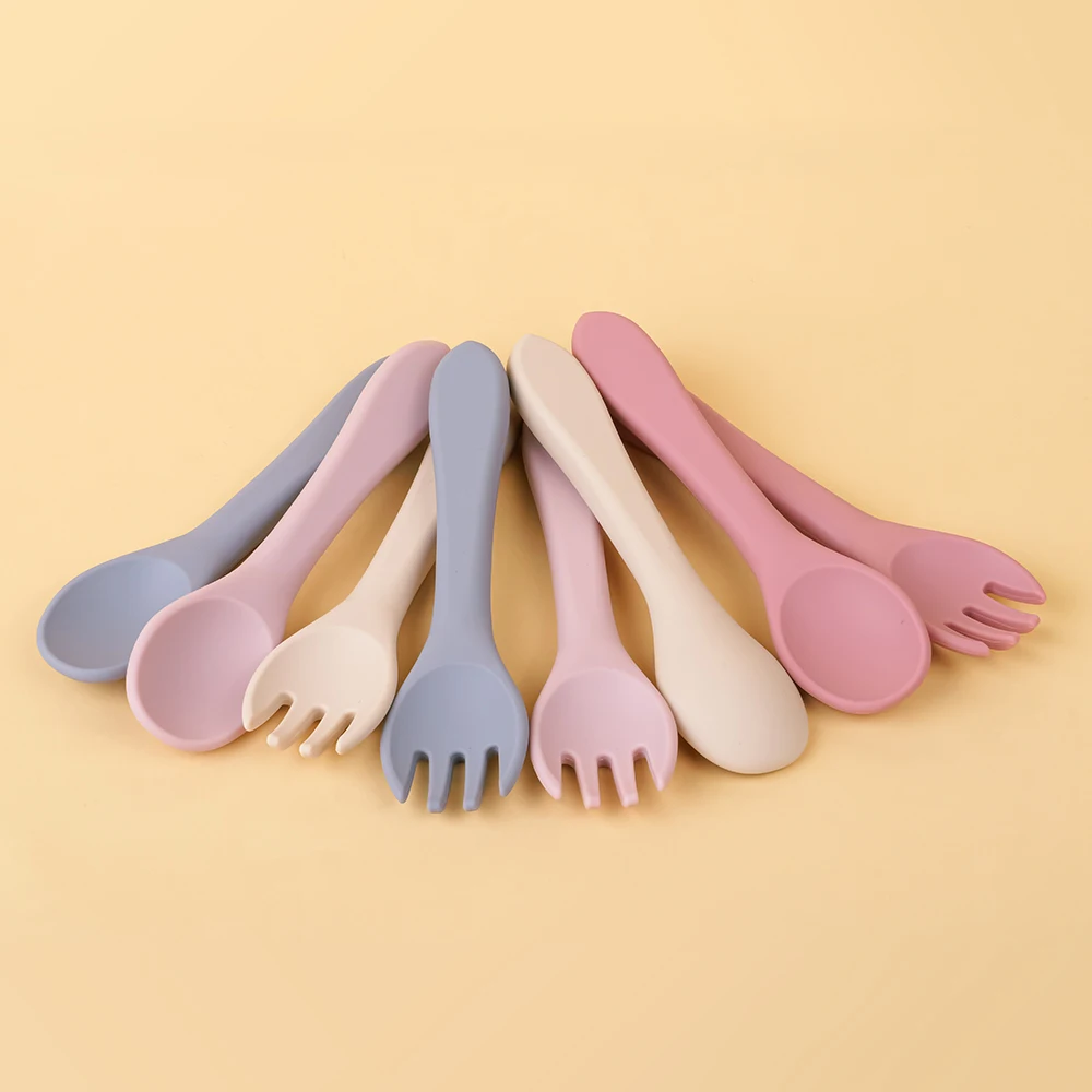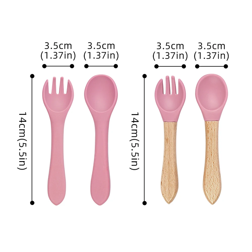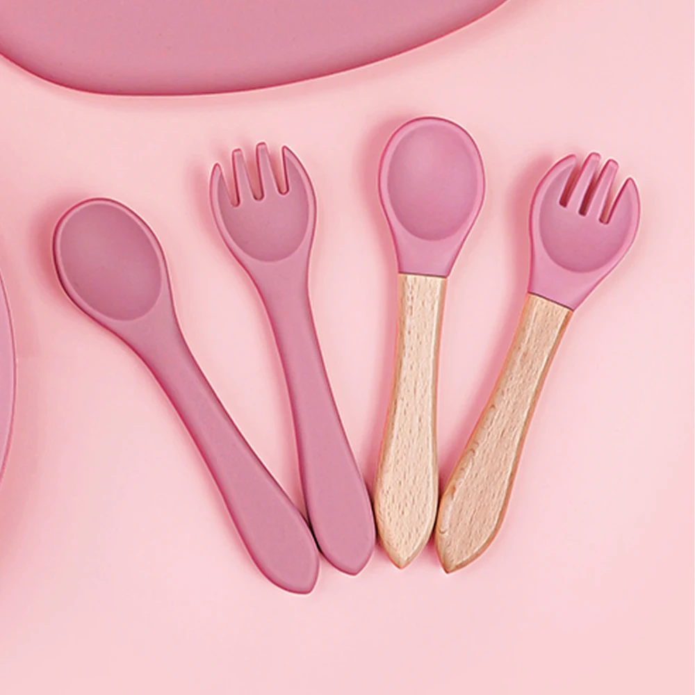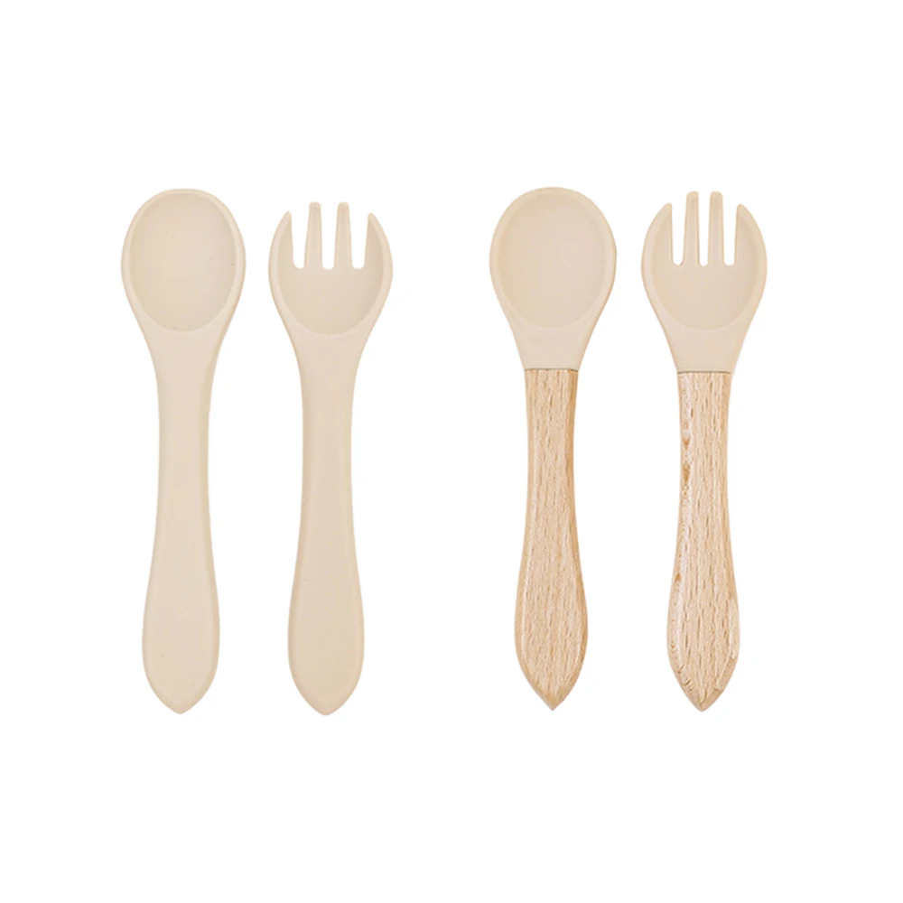 Juego de tenedor y cuchara de alimentación de bebé de silicona, sin BPA, mango de madera, utensilios de entrenamiento para bebés, accesorios para recién nacidos, 4 Uds.