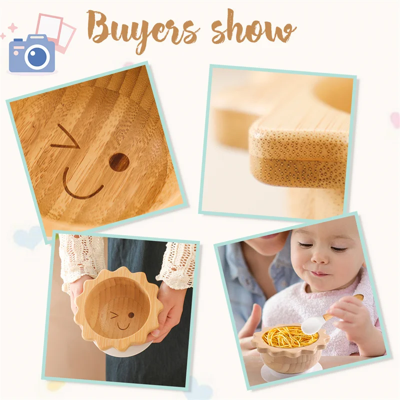 Comprar Juego de tenedor y tazón antideslizante para bebé, cuchara, vajilla en forma de sol, herramientas de alimentación infantil, vajilla de madera de bambú para niños, regalos para bebés