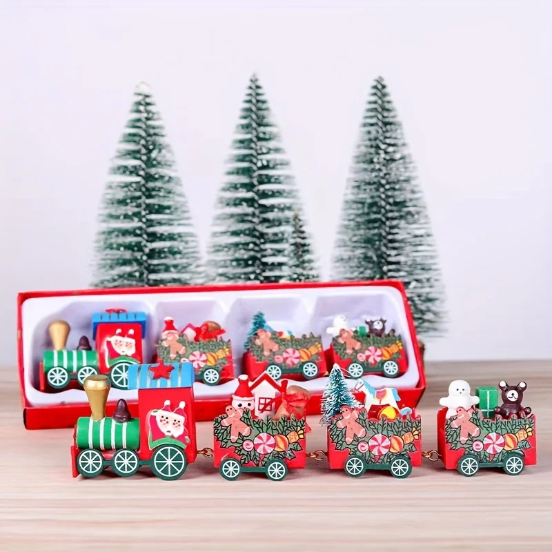 Tema navideño: Este tren navideño compuesto por 1 locomotora y 3 vagones está lleno de elementos navideños: Papá Noel, muñeco de nieve, árbol de Navidad, gingersnap, etc. Los compartimentos se pueden conectar o desmontar libremente. Los colores brillantes y los diseños vibrantes llenarán tu hogar de espíritu navideño.