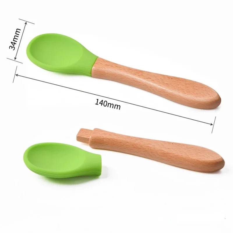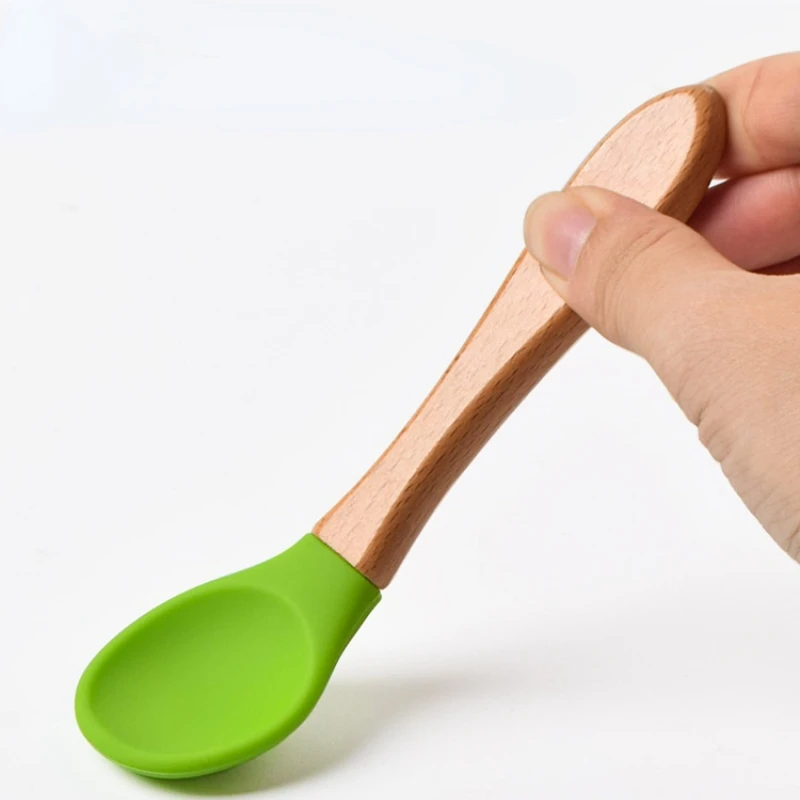 Comprar Juego de vajilla de alimentación con mango de madera, 2 uds., puntas de silicona de calidad alimentaria para entrenamiento de bebé, cuchara, tenedor