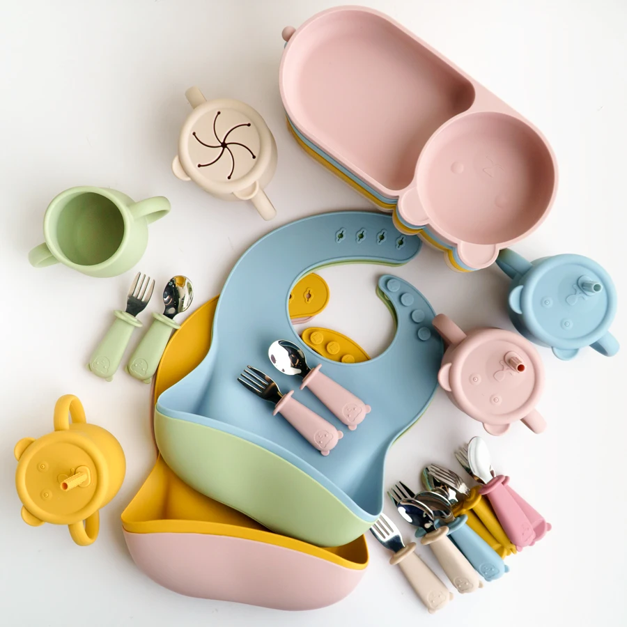 Juego de vajilla de silicona para alimentación de bebés y madres, platos impermeables con ventosa, cuenco, tazas, babero, artículos para bebés sin BPA con envío gratis