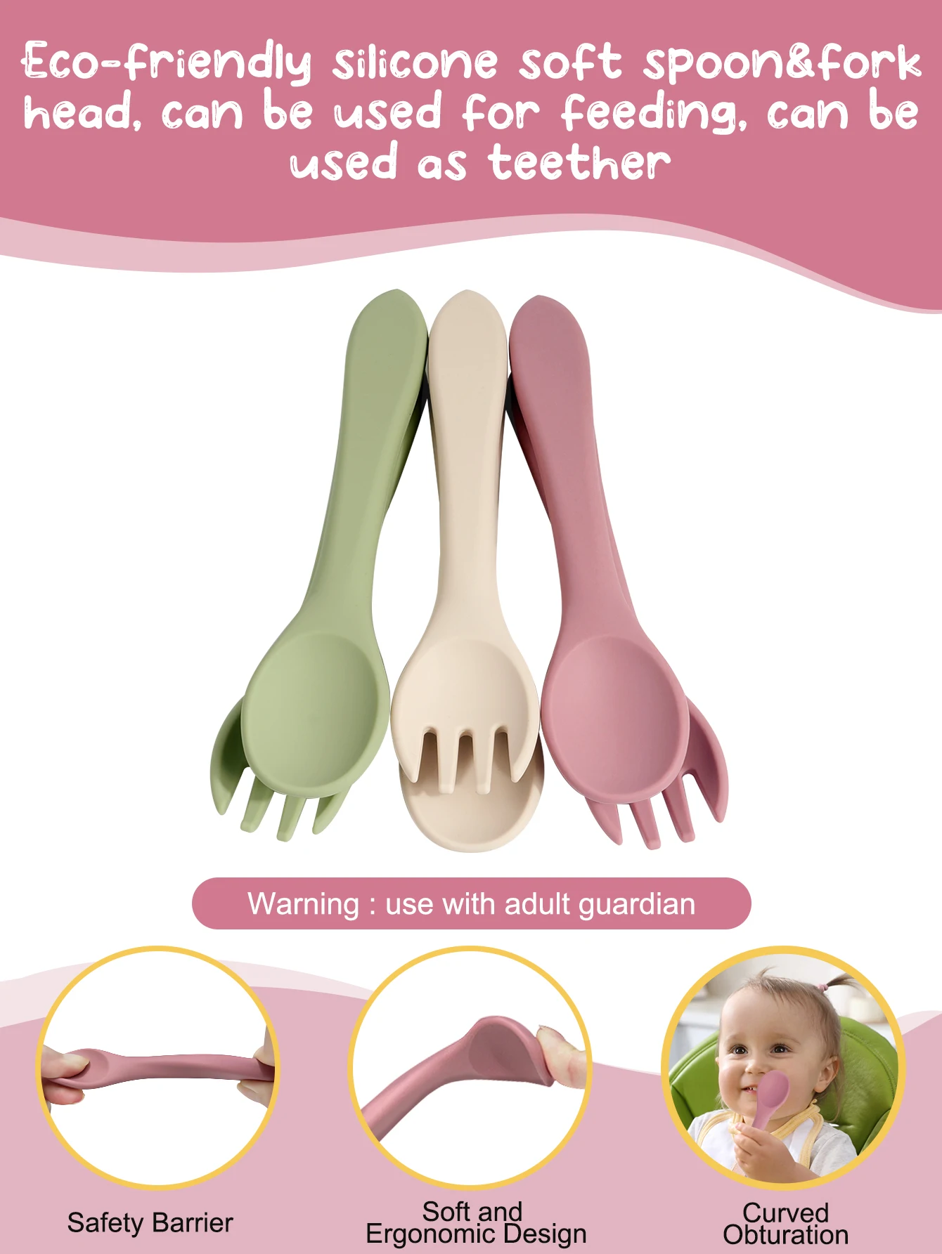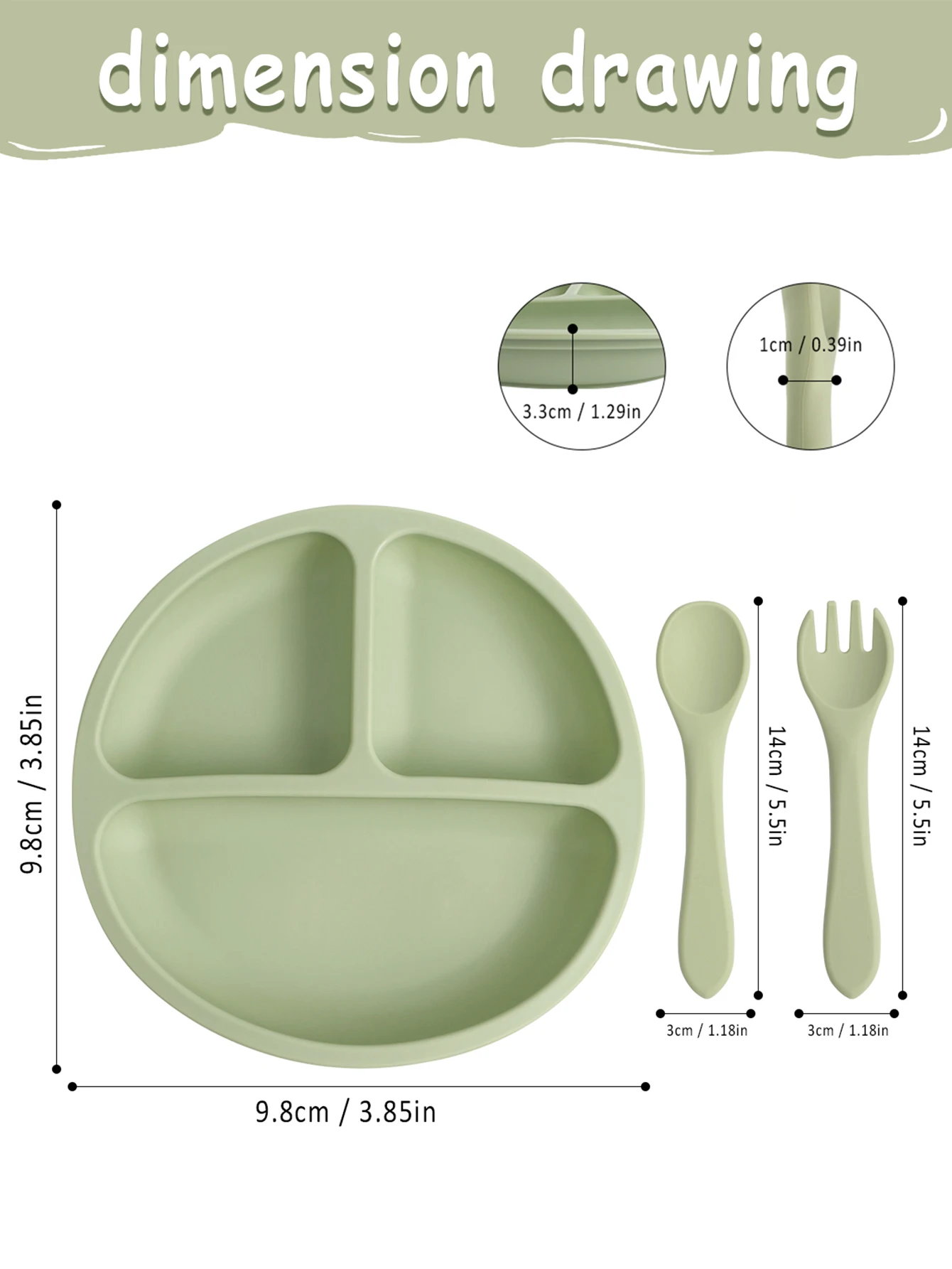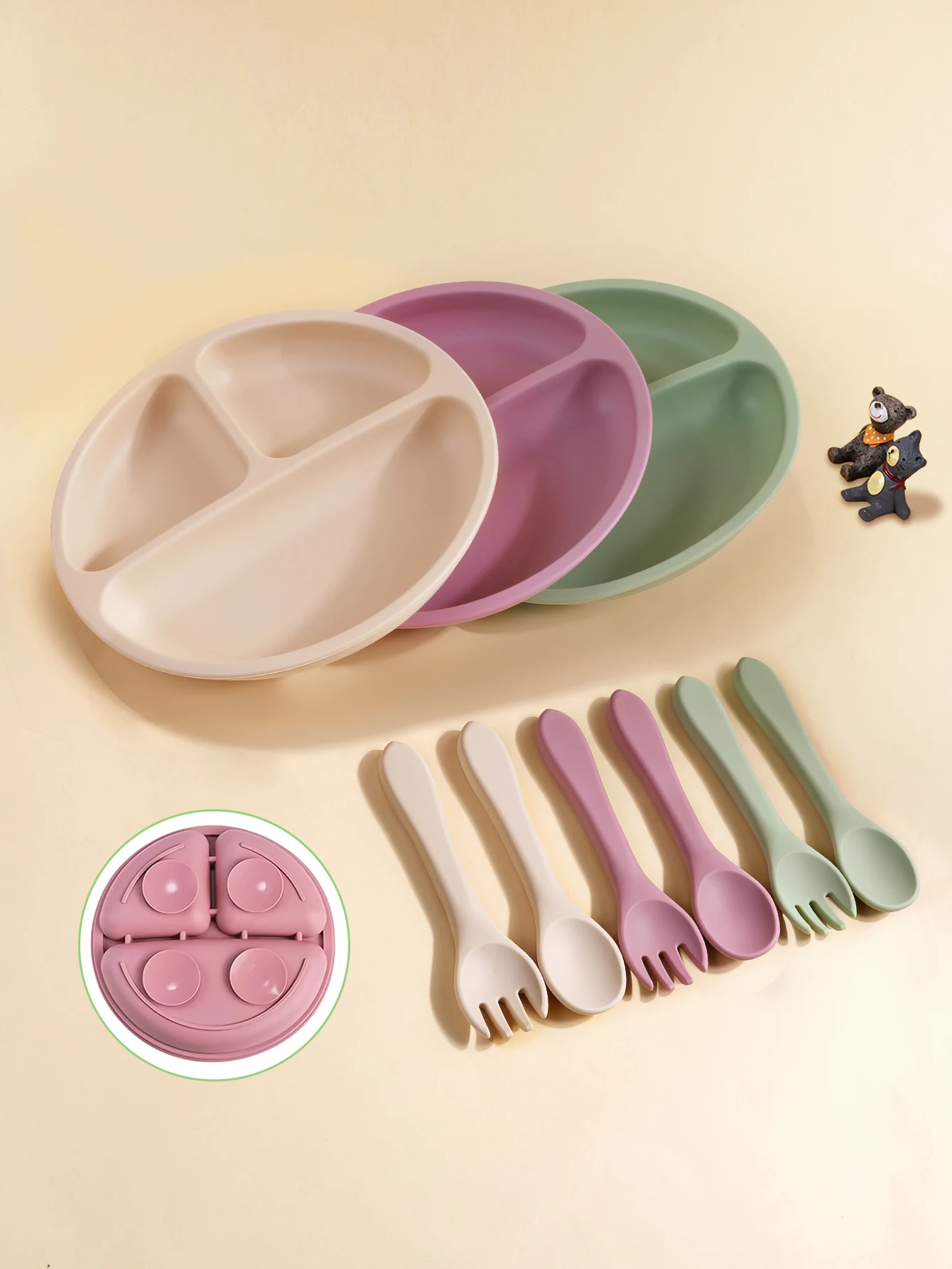 Juego de vajilla de silicona para bebé, plato de alimentación de alimentos complementarios, fuerte succión, cuchara corta de dibujos animados, tenedor, fácil de agarrar, 3 uds.