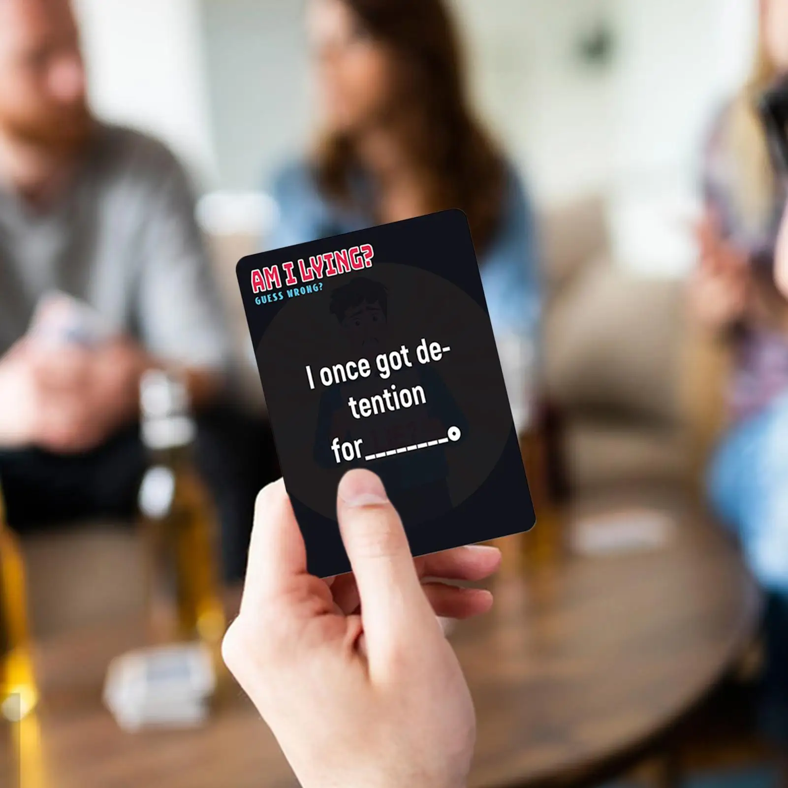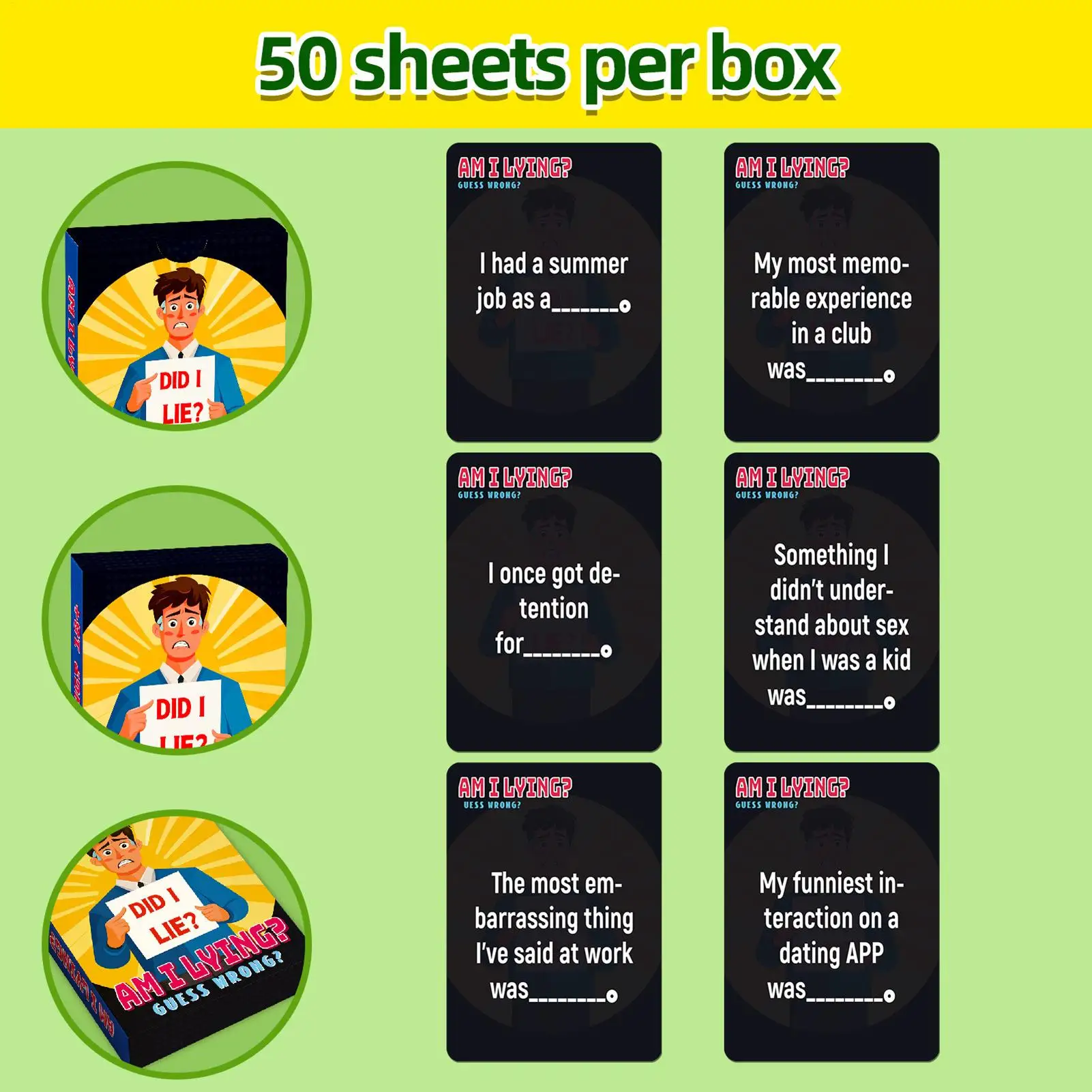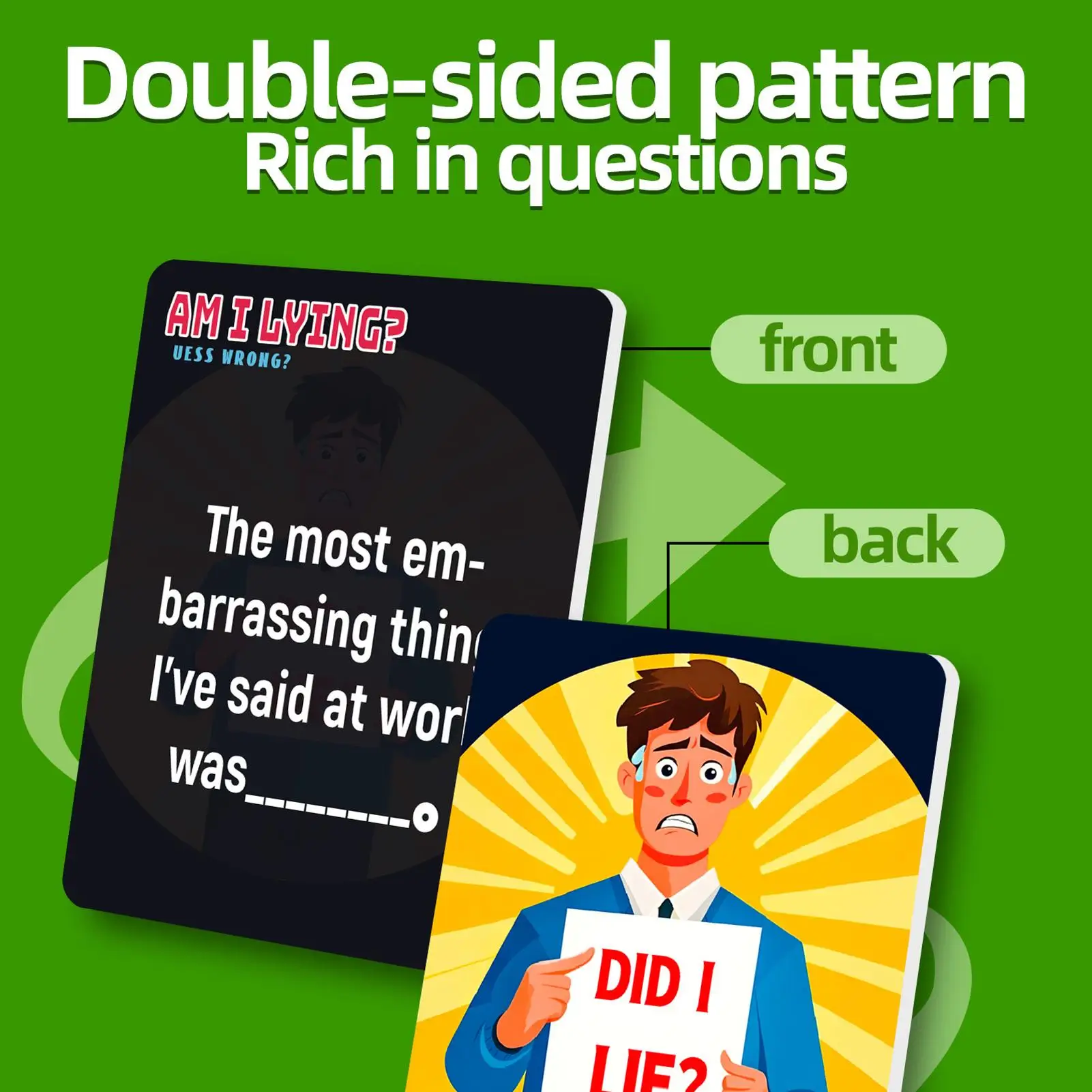 Gameplay: Los jugadores se turnan para dibujar cartas y preparar una mentira o contarles hechos reales según las indicaciones de las cartas.Otros jugadores adivinan si la otra parte está tumbado.Aumente la diversión y la competitividad del juego mediante votación o discusión.