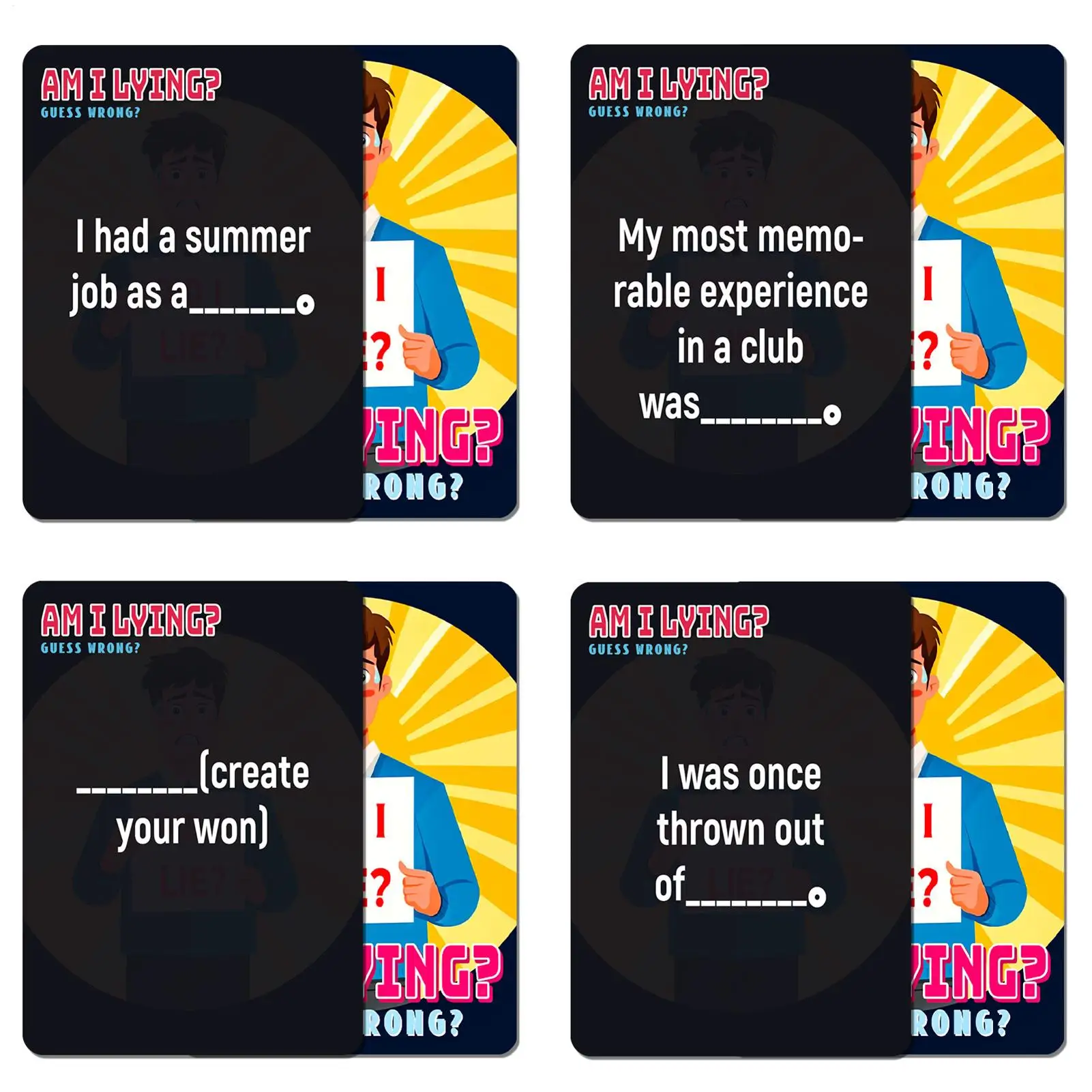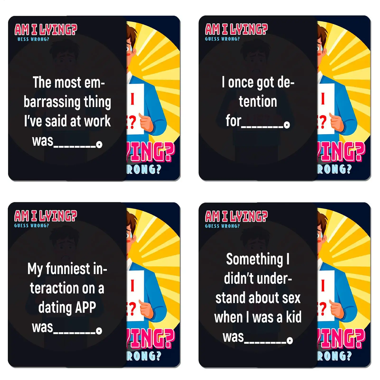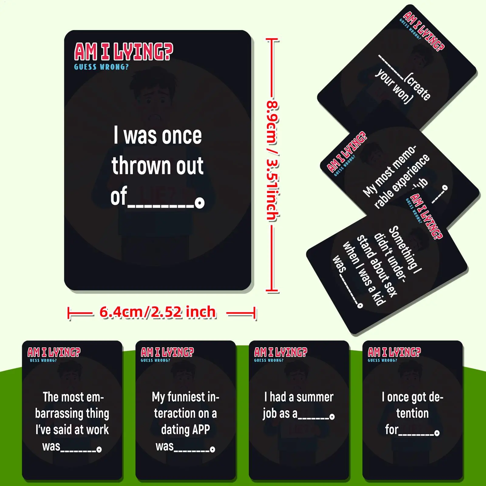 Gameplay: Los jugadores se turnan para dibujar cartas y preparar una mentira o contarles hechos reales según las indicaciones de las cartas.Otros jugadores adivinan si la otra parte está tumbado.Aumente la diversión y la competitividad del juego mediante votación o discusión.