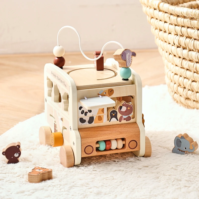 Juguete Montessori de madera para bebé, coche de juguete de cinco entradas, poliedro, autobús ocupado, juguete para niños, Educación Temprana, mano, cerebro, sentido, órgano, juguetes, regalo